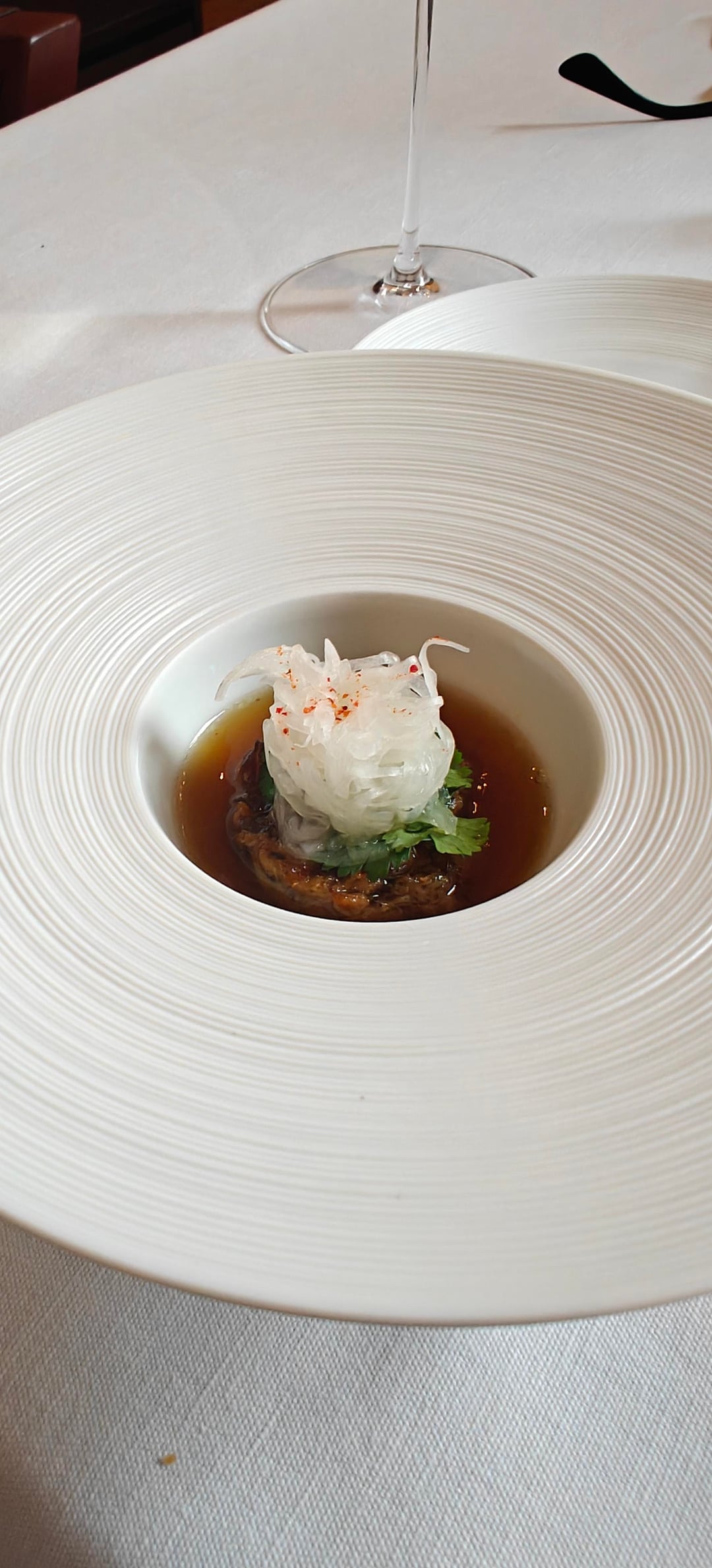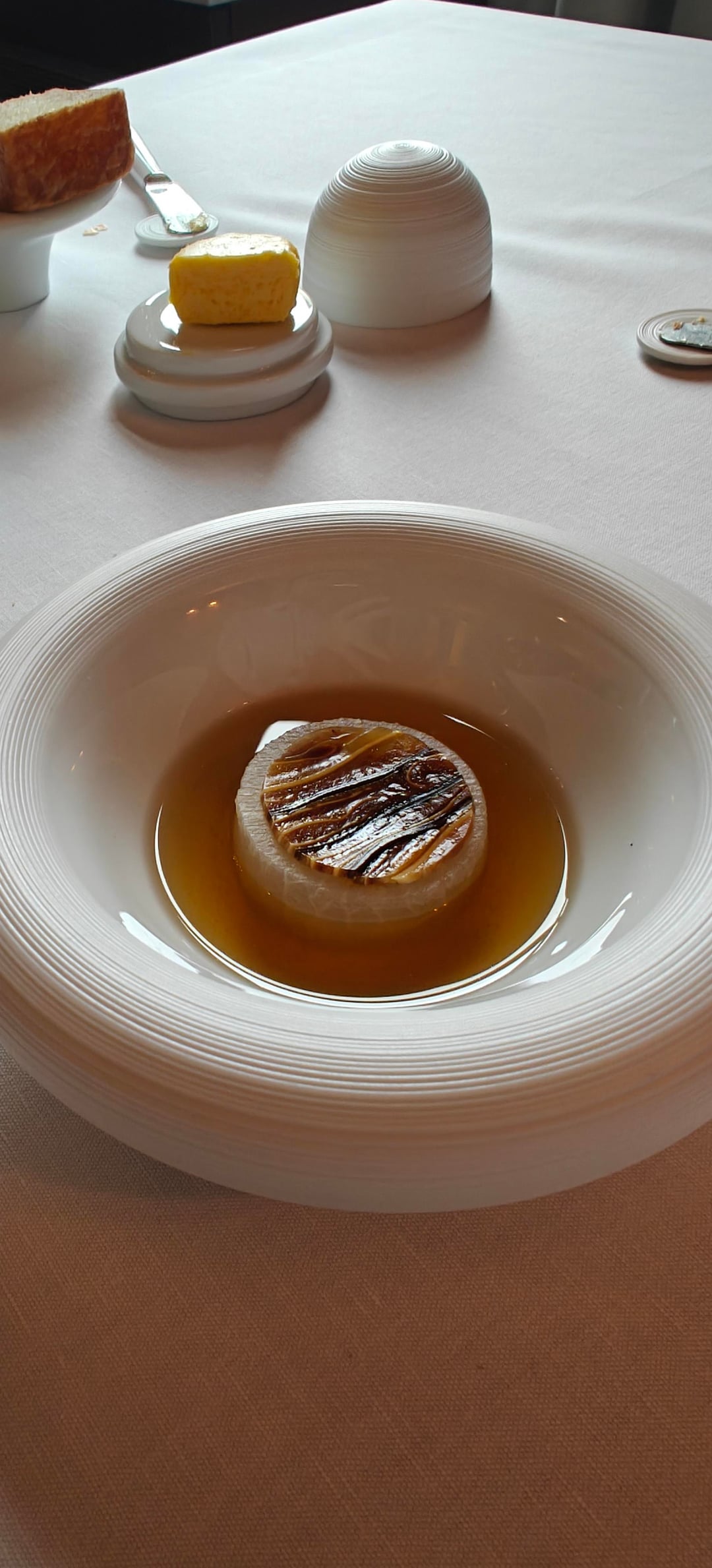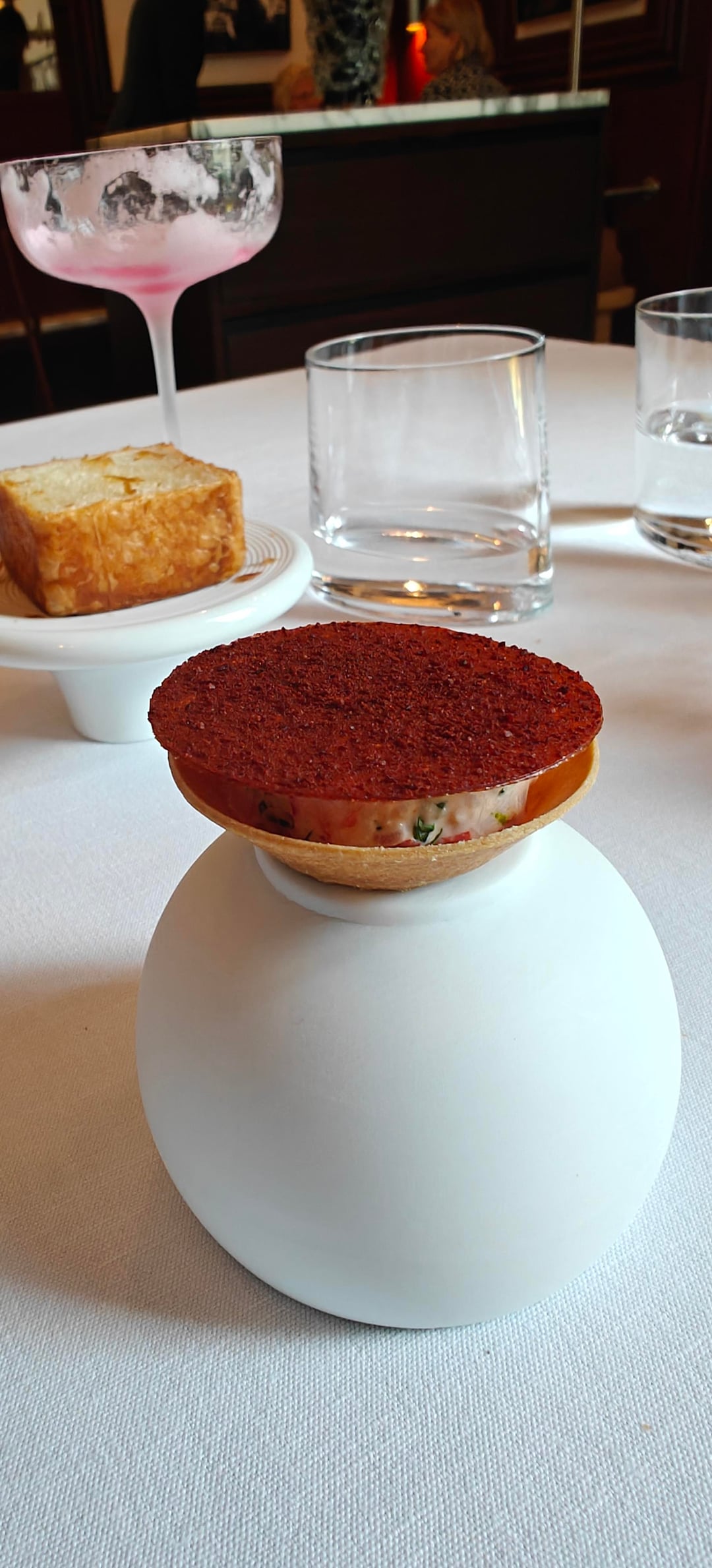I went during the lunch service and opted for the five-course Horta menu (€195). The service was friendly and professional. I started with a Clover Club-esque cocktail with hibiscus as they served an amazing brioche (in the background of picture #1) with a cruncy crust. Afterwards, I opted for a white Beaujolais by the glass. The first of three amuses was a tartlet with a type of lobster tartare and a spicy tuile. This was followed by a jambon persillé (ham and parsley terrine) topped with eel and a touch of horseradish. The last amuse was a more Asian-inspired grilled oyster with onion in a dashi broth.