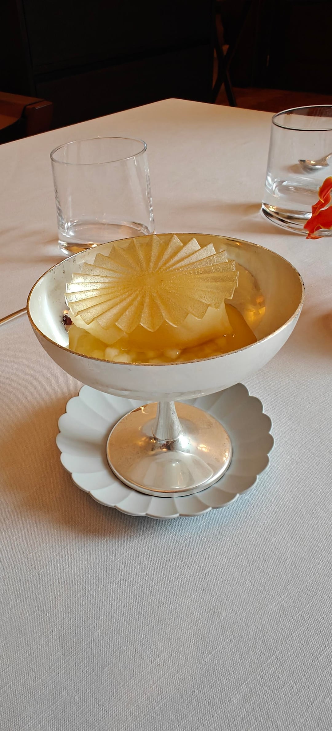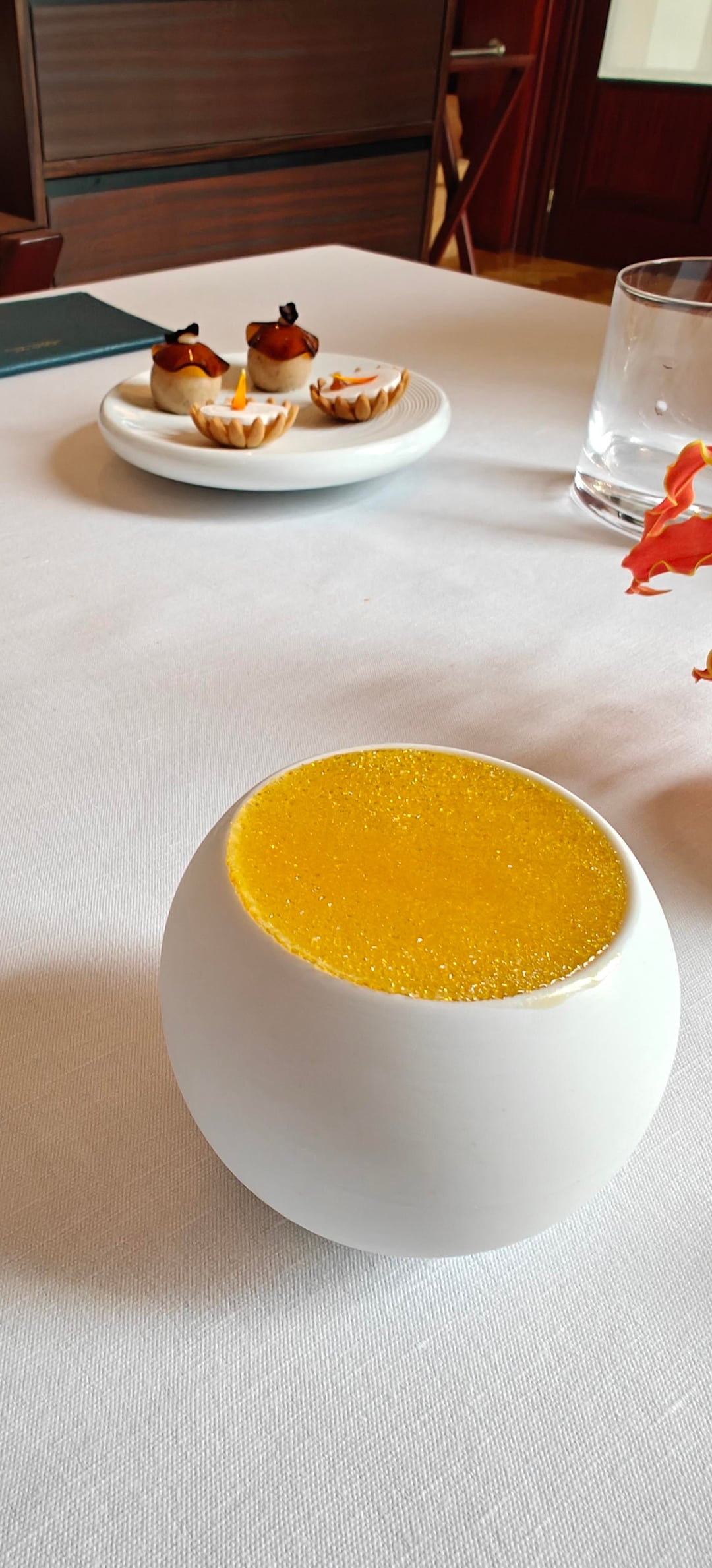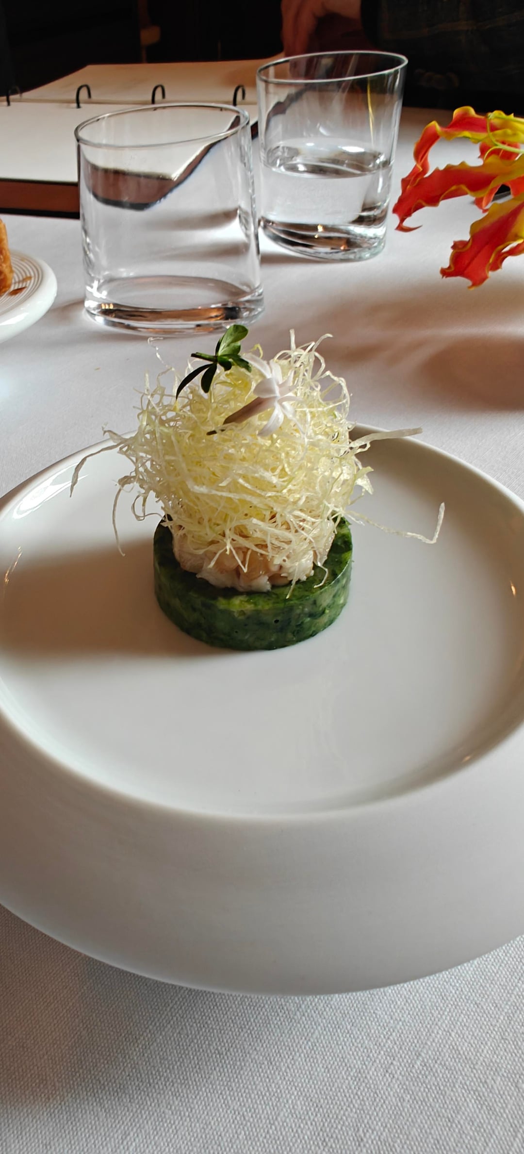 I went during the lunch service and opted for the five-course Horta menu (€195). The service was friendly and professional. I started with a Clover Club-esque cocktail with hibiscus as they served an amazing brioche (in the background of picture #1) with a cruncy crust. Afterwards, I opted for a white Beaujolais by the glass. The first of three amuses was a tartlet with a type of lobster tartare and a spicy tuile. This was followed by a jambon persillé (ham and parsley terrine) topped with eel and a touch of horseradish. The last amuse was a more Asian-inspired grilled oyster with onion in a dashi broth.