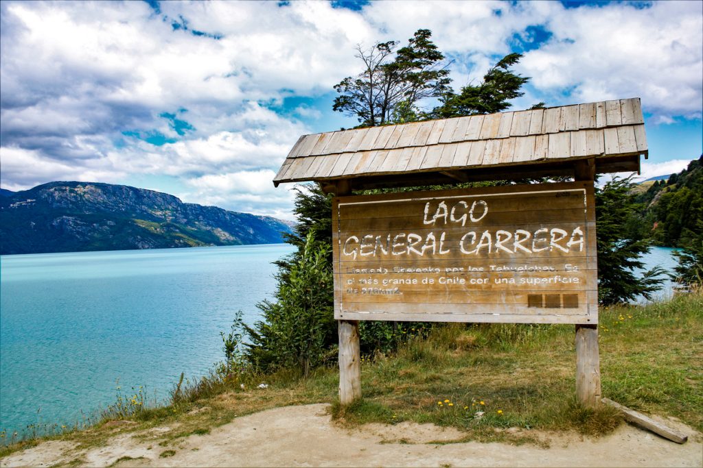Lago General Carrera, Chile – February 4, 2018: signage for the biggest lake in northern Chile, the Buenos aires lake or lake Carrera.