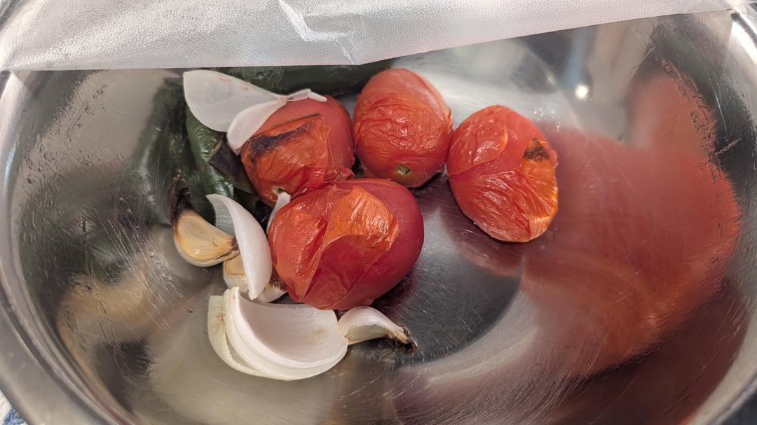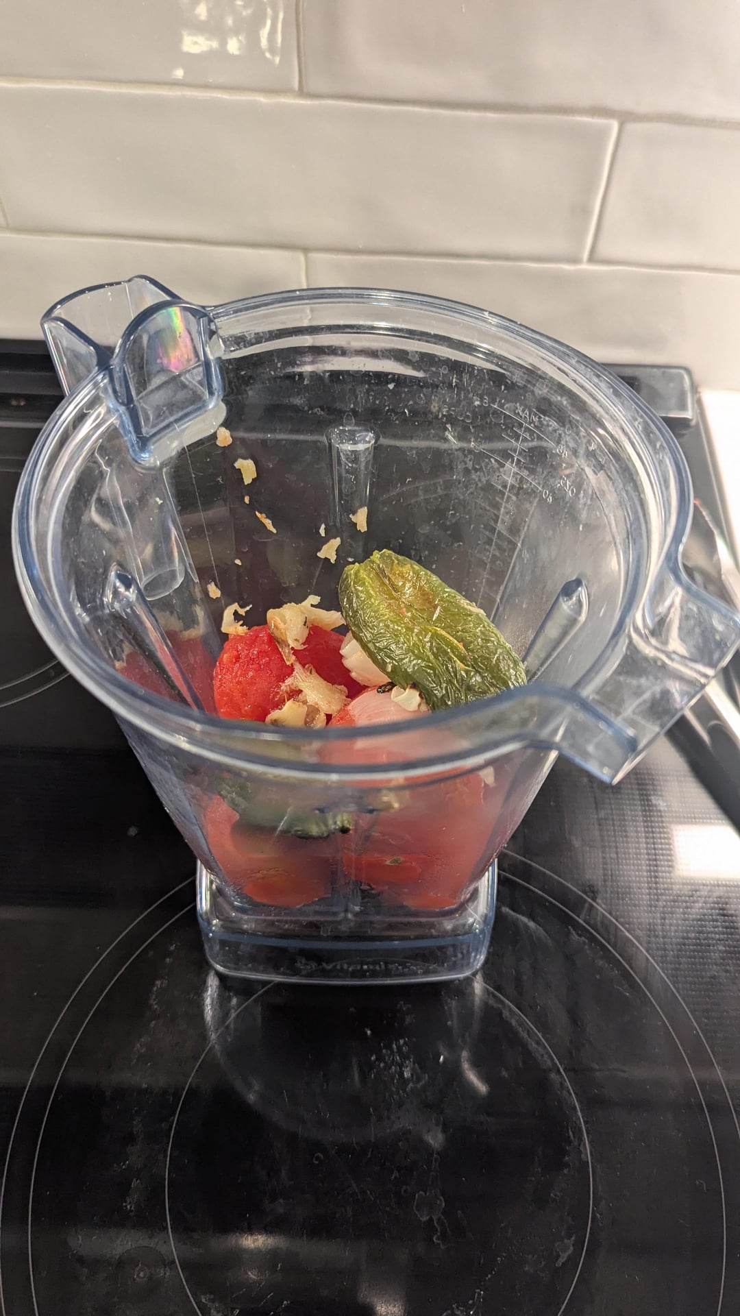 aquinoks 10 hours ago Four tomatoesTwo whole jalapenos1/4 yellow onionThree cloves garlicSaltPepperSplash of VinegarBroil vegetables till coloredPut in a bowl covered with plastic wrap for a bit to steamBlendTaste. If it’s flat add salt, if it’s dull add a bit more vinegarEnjoy