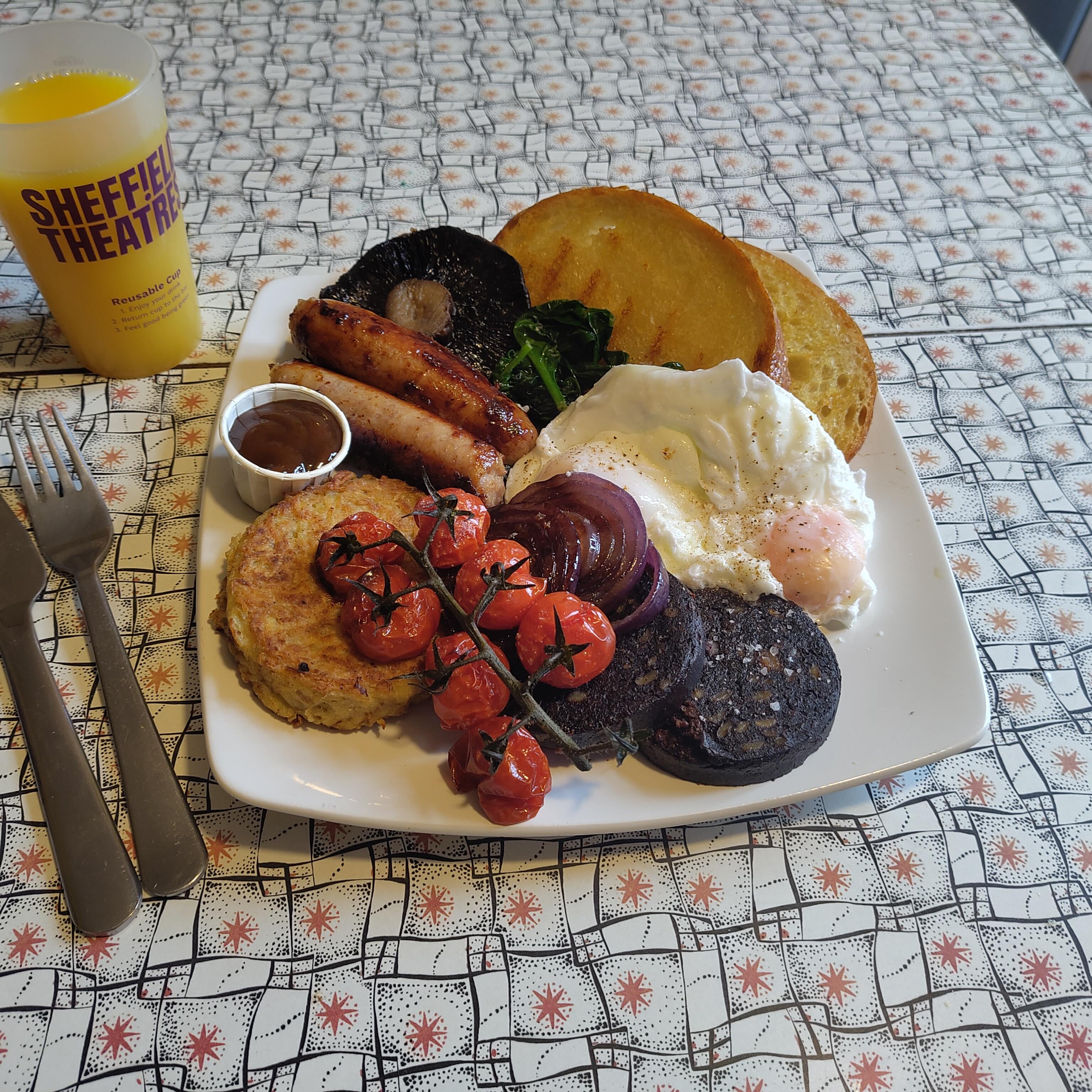 Local sausages, fancy local eggs (poached) & griddled sourdough (from the danish bakery round the corner) and red onion. Home made potato rösti. Bury black pudding, supermarket tomatoes mushroom & (at risk of rage baiting) butter fried spinach.