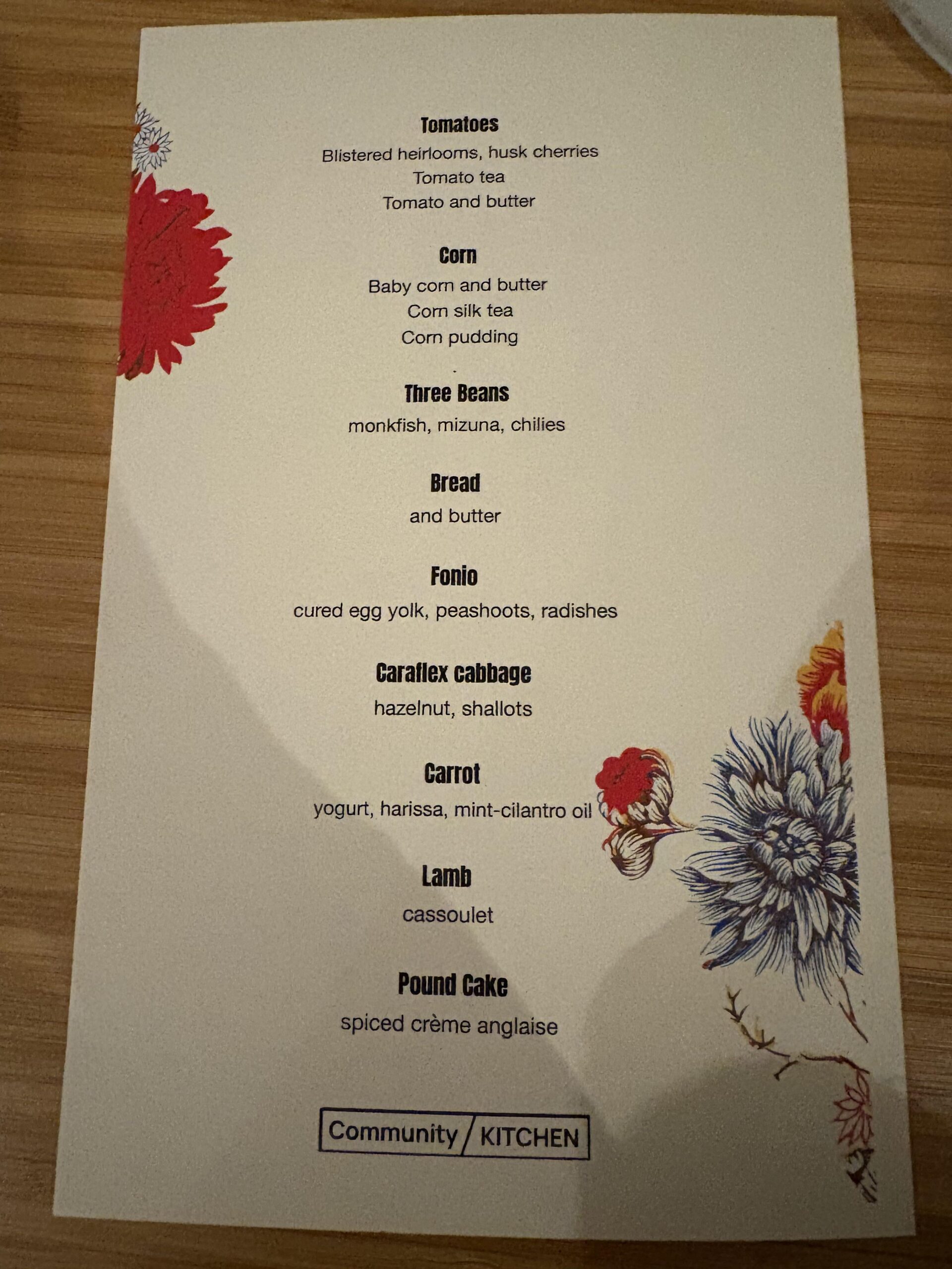 We had a lovely meal at the community kitchen. Figured I would post the menu from the night we went 10/2! Every course was great- the corn silk tea, pudding and baby corn was awesome. The fonio was also impressive! We enjoyed all the courses and the servers were lovely.
