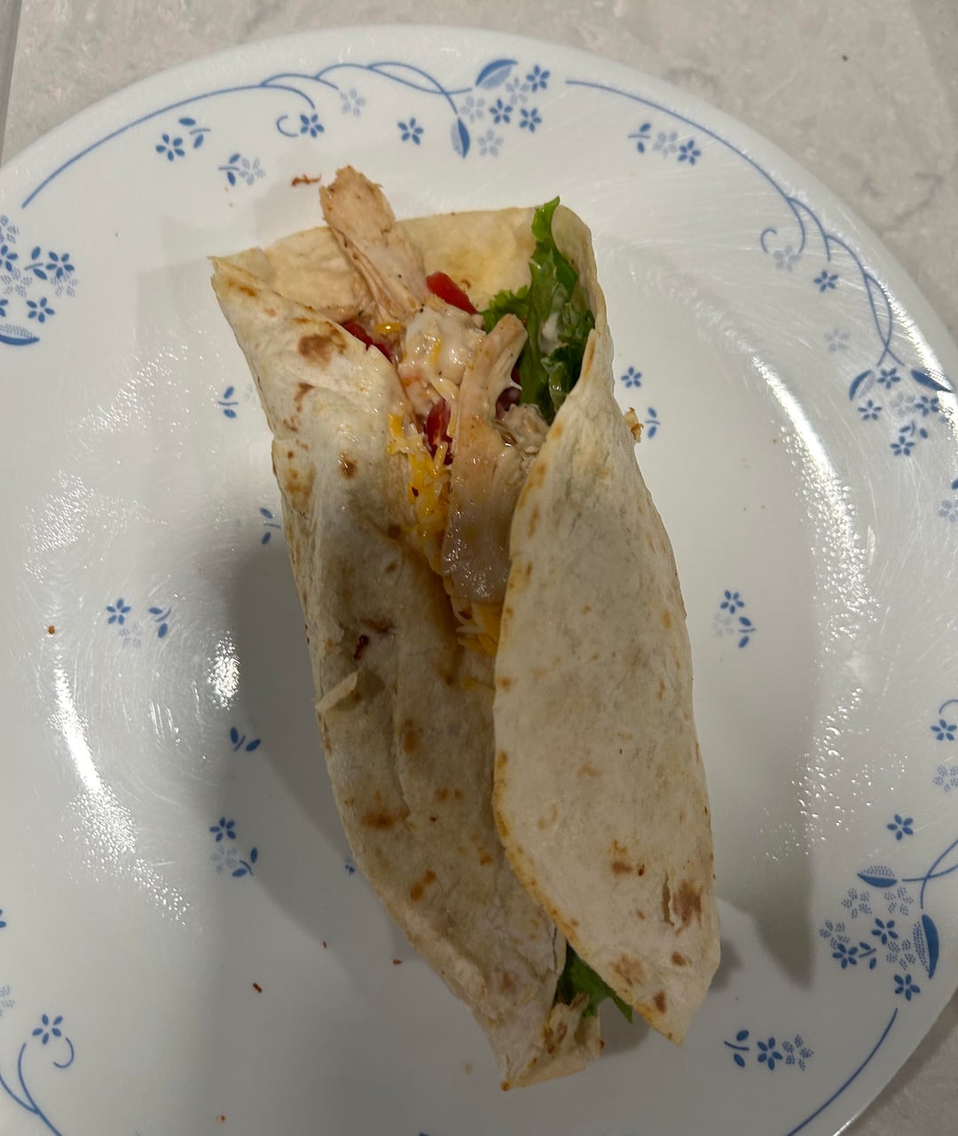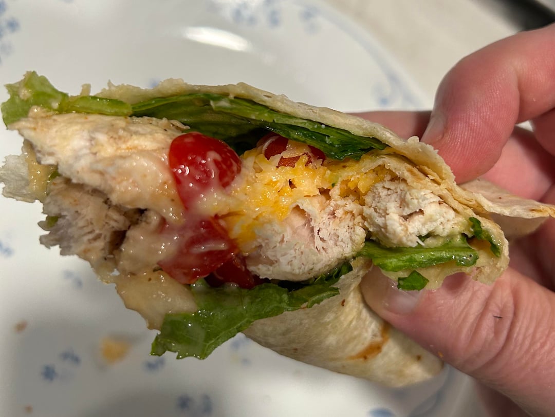 Third meal I made from our Sunday chicken dinner. Took one cooked bone in chicken breast and sautéed with leftover chicken fat and butter (which developed originally from the first meal I made – great flavor) to warm thru plus add more of the homemade roast chicken spice mix. Washed and prepped some green leaf lettuce (cheaper than Romaine), grape tomatoes and finely shredded Colby jack from the block. One chicken was done I removed from skillet, sprayed with cooking spray and toasted my tortilla thru. Assembled with lettuce on bottom, then chicken, grape tomatoes, small amount of ranch dressing and top with shredded cheese. My folding job isn’t as good as Micky Ds…but I like the taste of mine better.