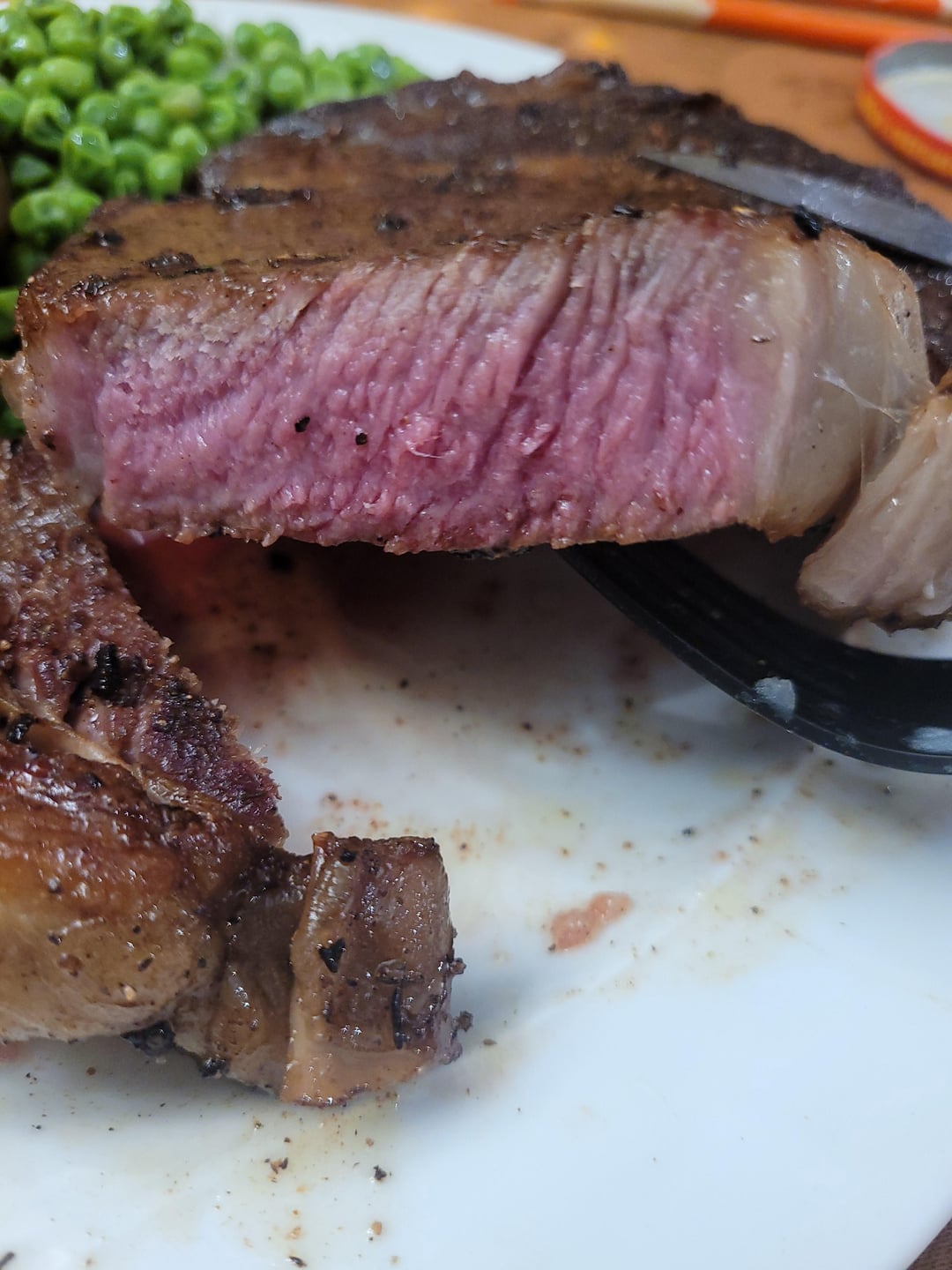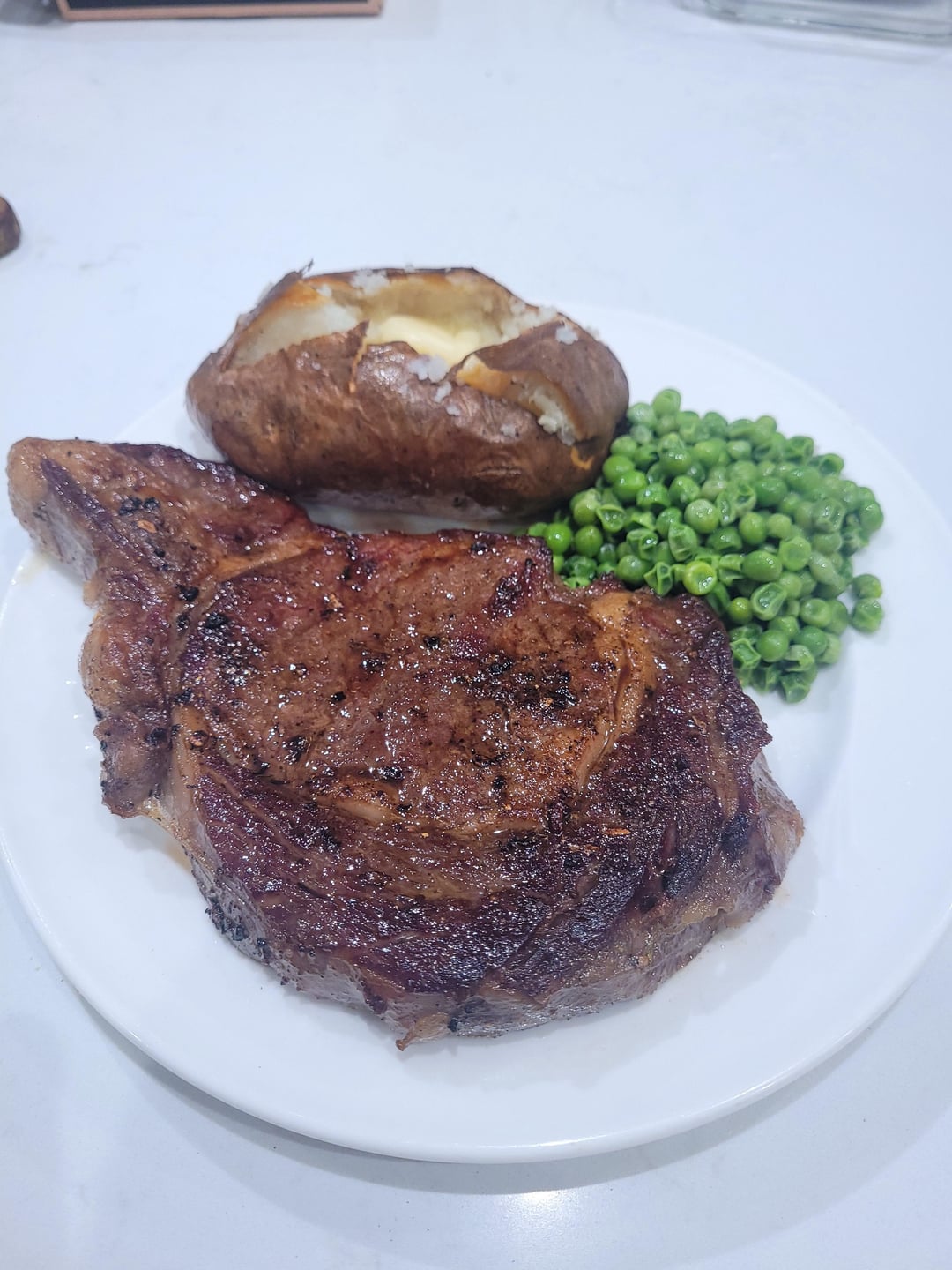 Cooked a couple of ducks last month and saved the rendered fat. Decided to try it for the steak and came out great. Also used it on the baked potato skin. Ribeye cooked at 130f for 2 hours.
