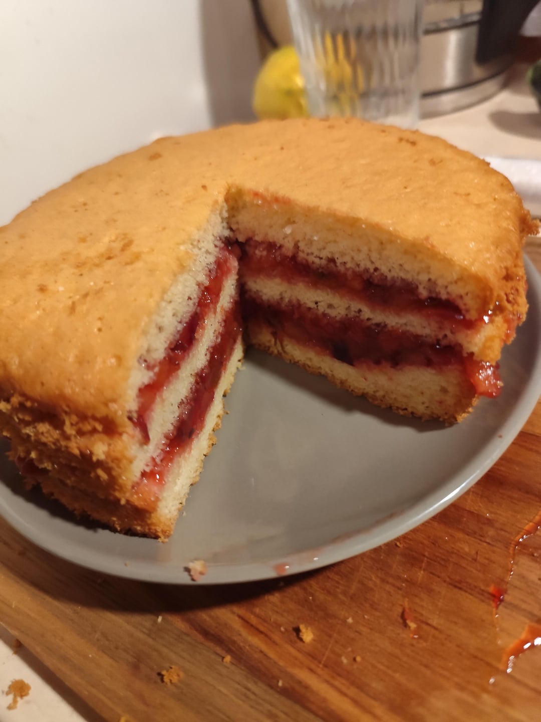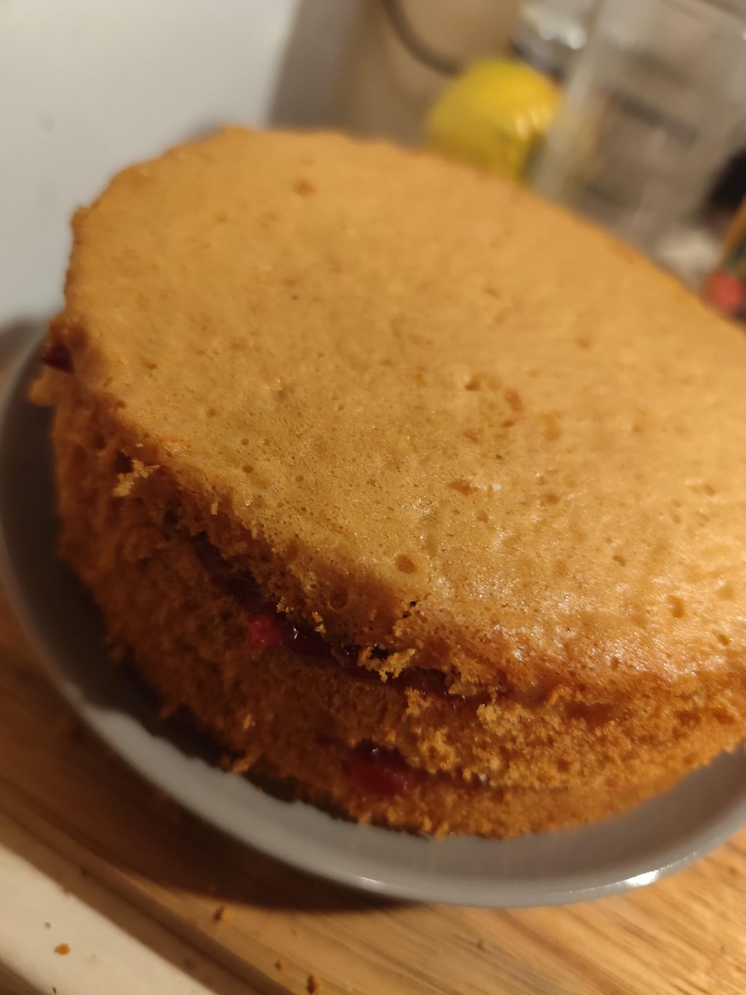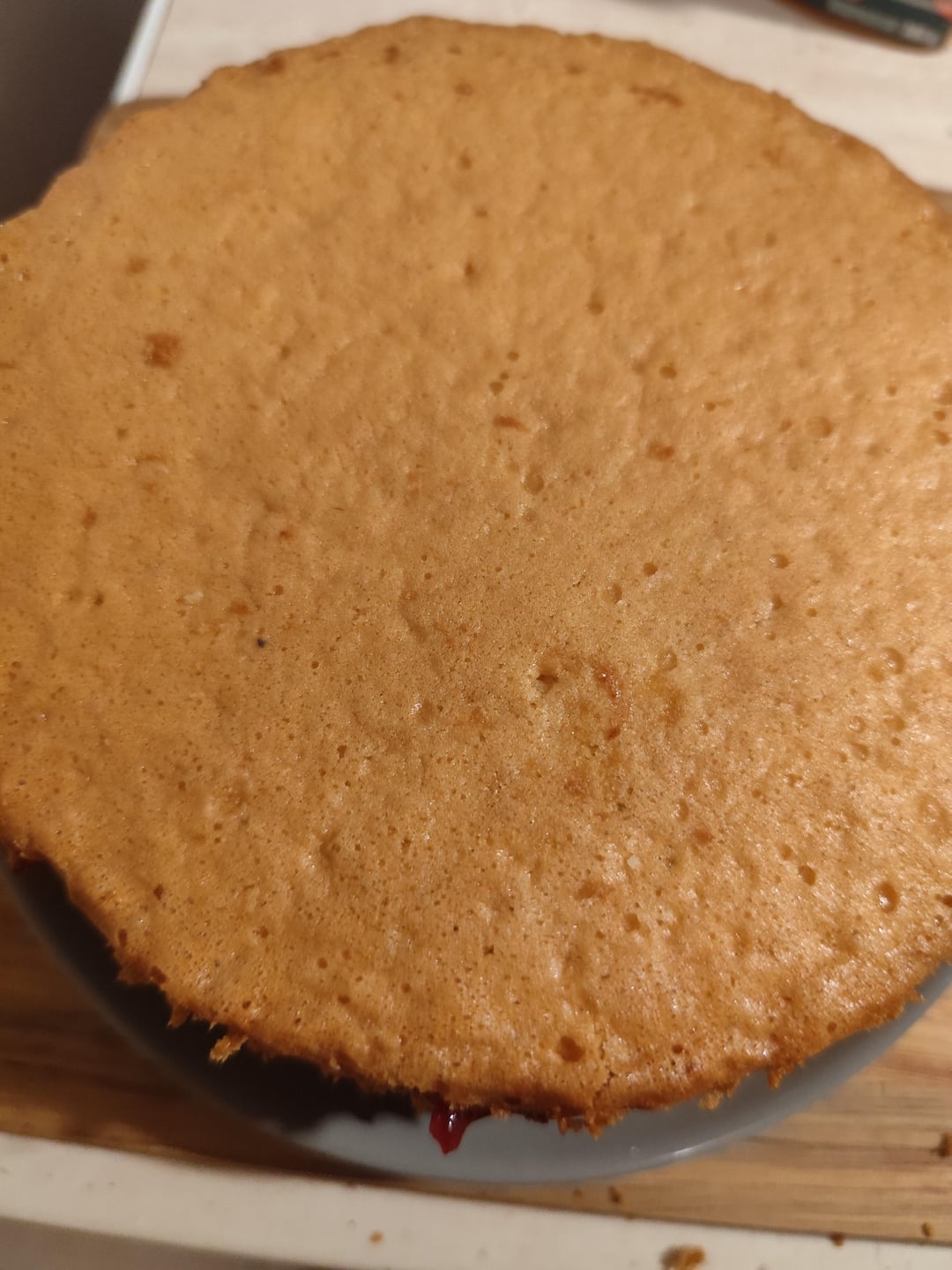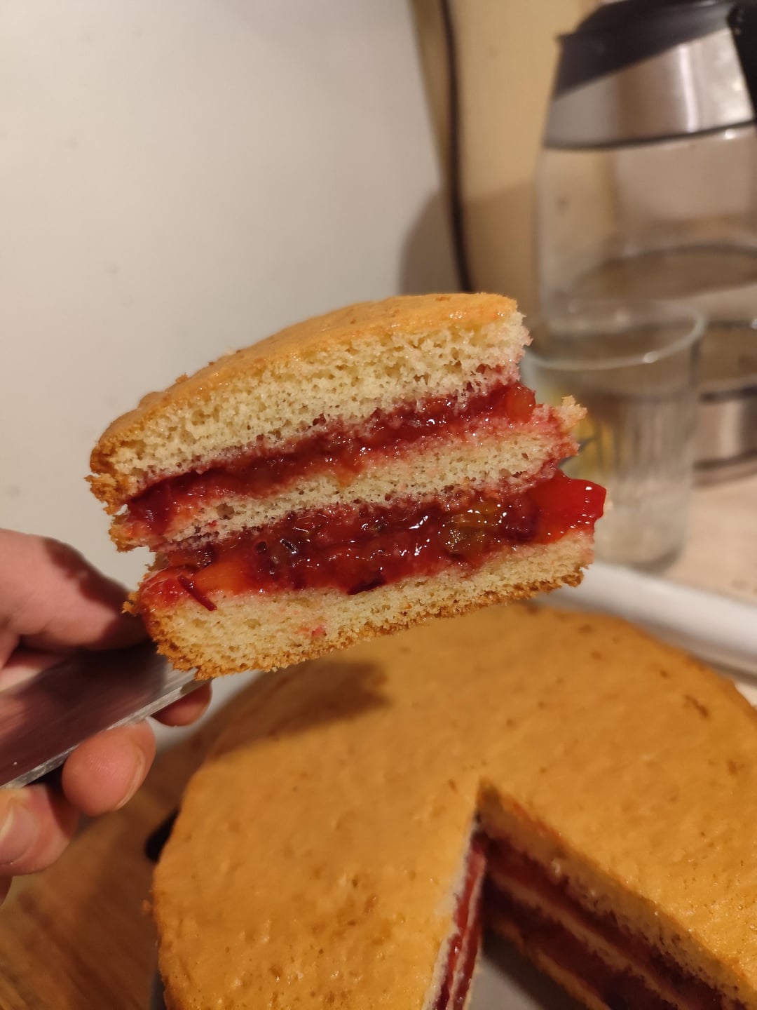 Sponge cake 3 eggs, 100 g flour, 100 g sugar, 20 gbutter. I wanted something to go with my coffee😅 by SilentWiness 2 Comments Massive_Long_276 13 hours ago oh this looks very tasty may have my slice with some cream or custard thanks 😀 kmaddock7 9 hours ago Where’s the tart? You mean sponge cake with plum jam?