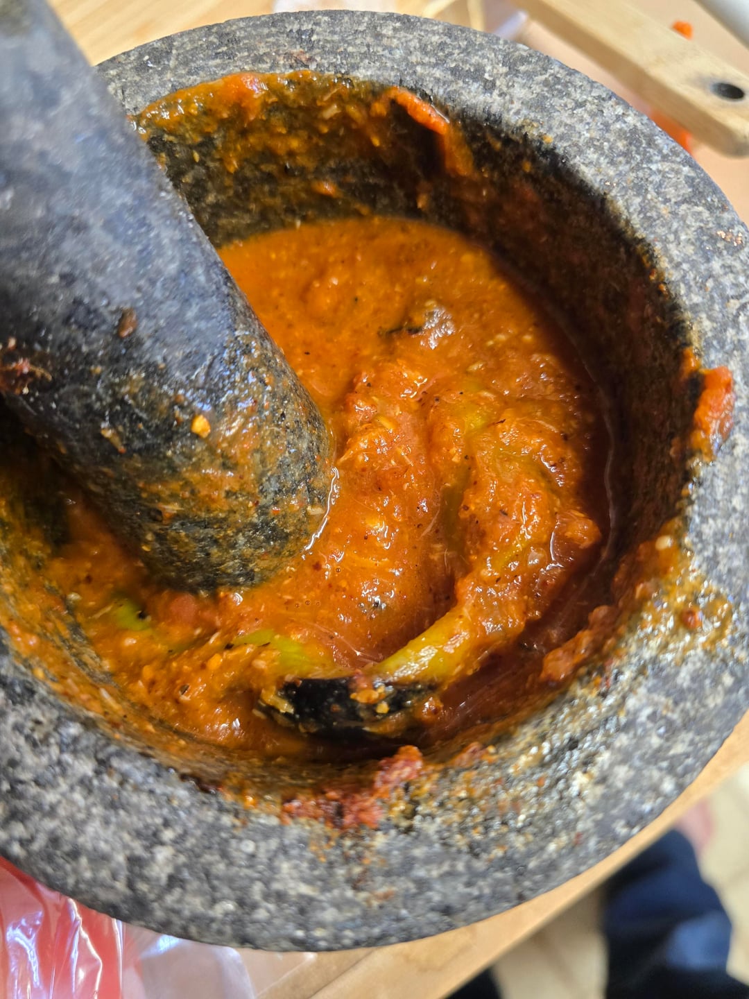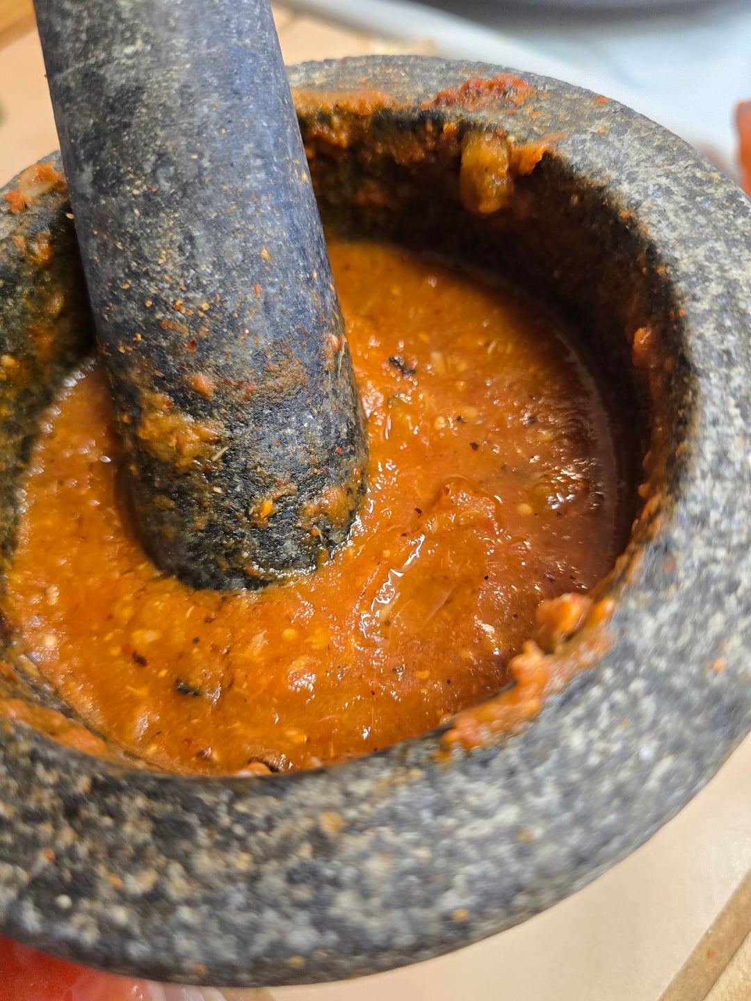 Peel roasted garlic and grind with chile/salt powder to a paste