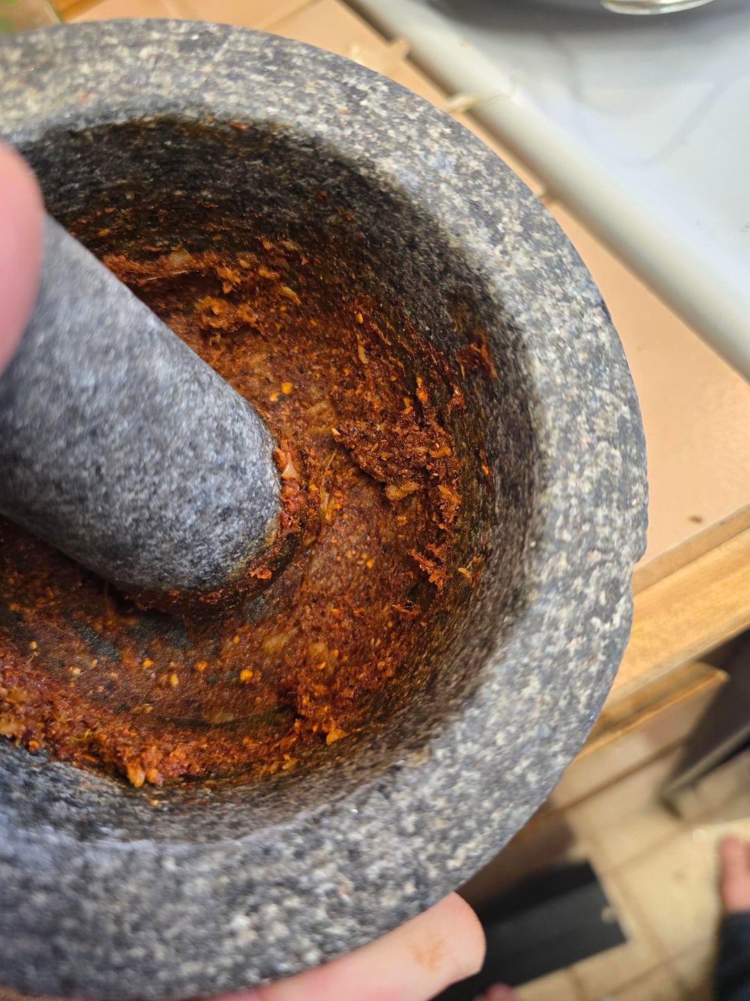 Grind toasted chiles and cumin with some salt to powder (including skins) DO THIS FIRST!