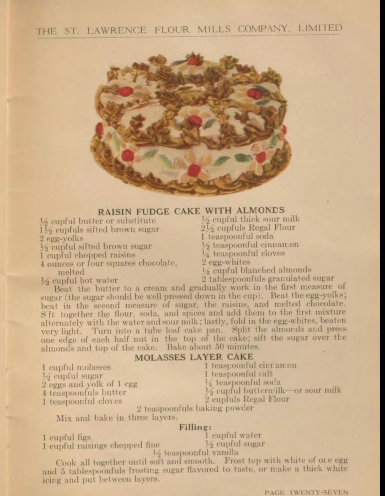 Raisin Fudge Cake with Almonds from 1927.by CryptographerKey2847 2 Comments danktempest 5 hours ago I assume the sour milk can be replaced with buttermilk just like the bottom recipe right? This would make a nice cake for Christmas. FinNerDDInNEr 4 hours ago It says thick sour milk. I would use sour cream or Greek yogurt. I think the picture is the molasses cake though