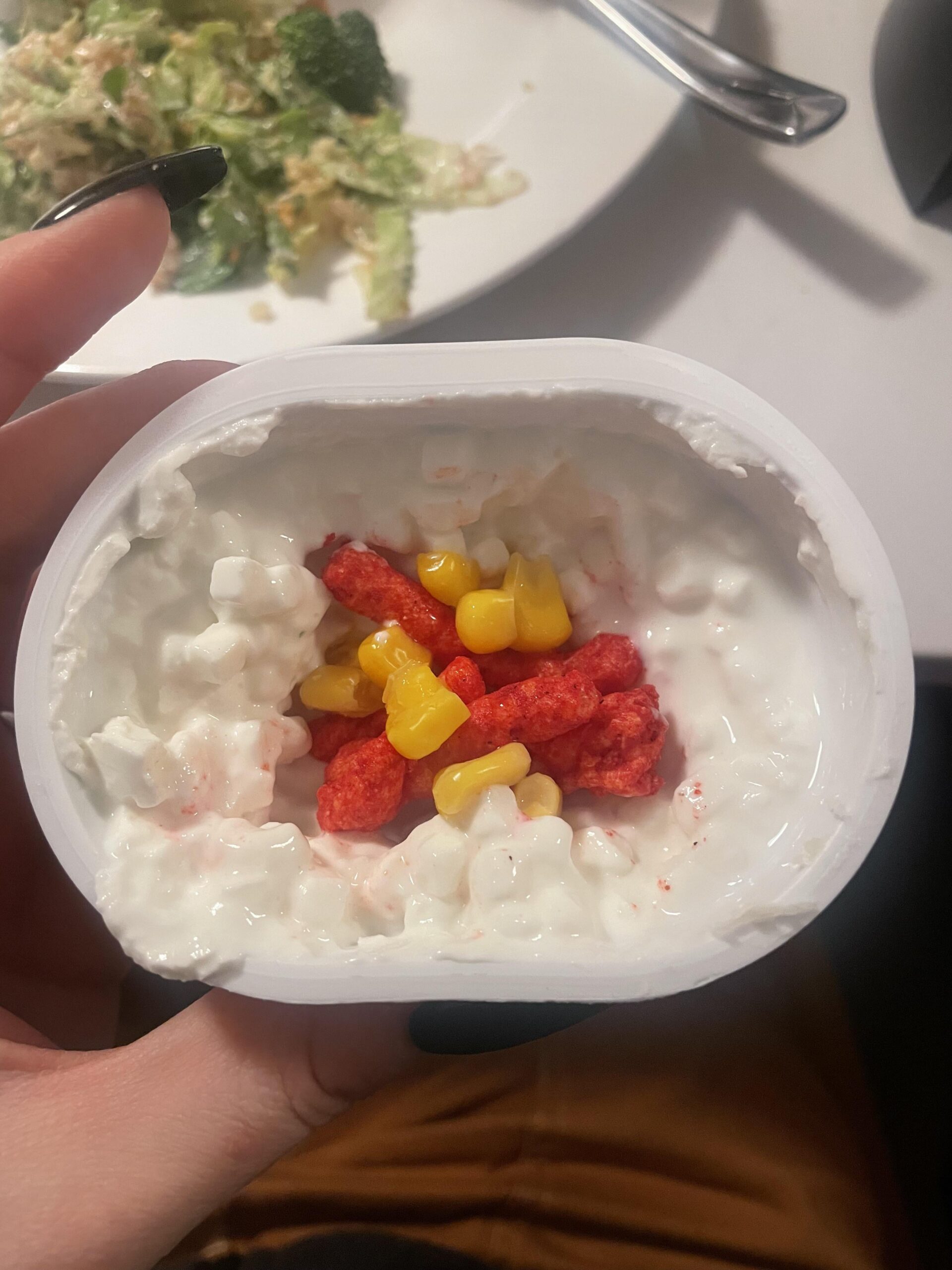 AkuTheNiceGuy 2 months ago Run this one by me again chief. I get the cottage cheese and corn, but hot cheetos?