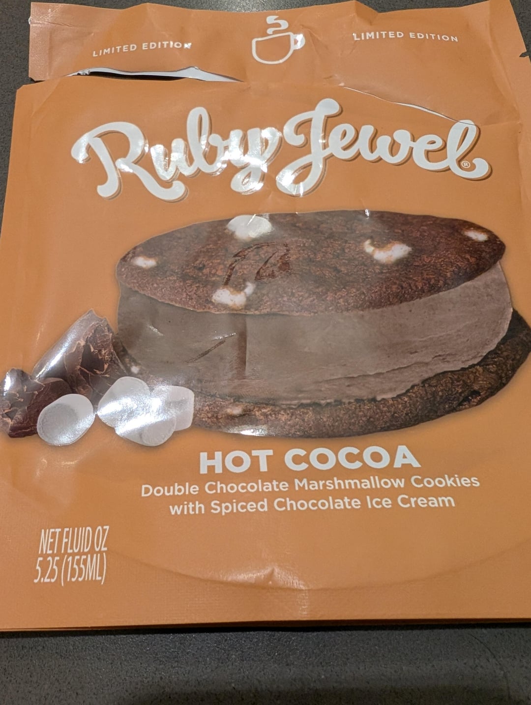 Ruby Jewel Hot Cocoa Double Chocolate Marshmallow Cookie with Spiced Chocolate Ice Cream for National Sandwich Day. Another win from this local company.