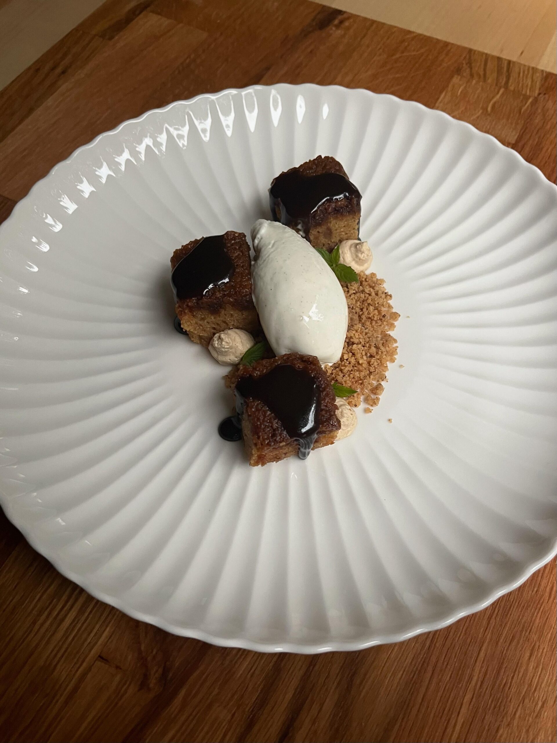 A bit more about the dish: sukkari date sticky pudding, coconut sugar and dark spiced rum toffee sauce, sour cream and vanilla bean gelato, walnut crumble and a carob chantilly.