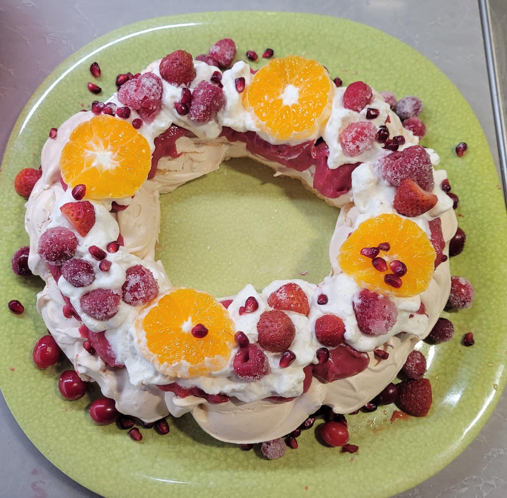 Pavlova topped with cranberry curd, whipped cream and clementines, sugared berries, and pomegranate seeds. I added fresh mint leaves here and there after I took the photo. Looks fancy; super easy to make. (Just don't rush the meringue -as usual!)