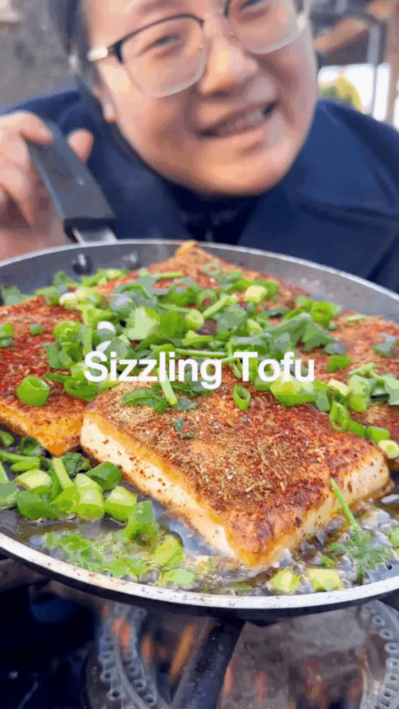 1. Slice the block of tofu(each slice about 0.5-0.8mm thick). Cut the scallion and coriander into small pieces. If you have cumin seeds, smack them before using. 2. Heat up a flat, non-stick pan with medium-high heat, when the pan is hot, add oil, add the tofu, pan fry for 1-2 minutes until one side is slightly crispy, flip it carefully. On the tofu, sprinkle the cumin, chili powder, 5 spices and salt evenly. 3. Cook for 2-3 mins more, add scallion and coriander, enjoy