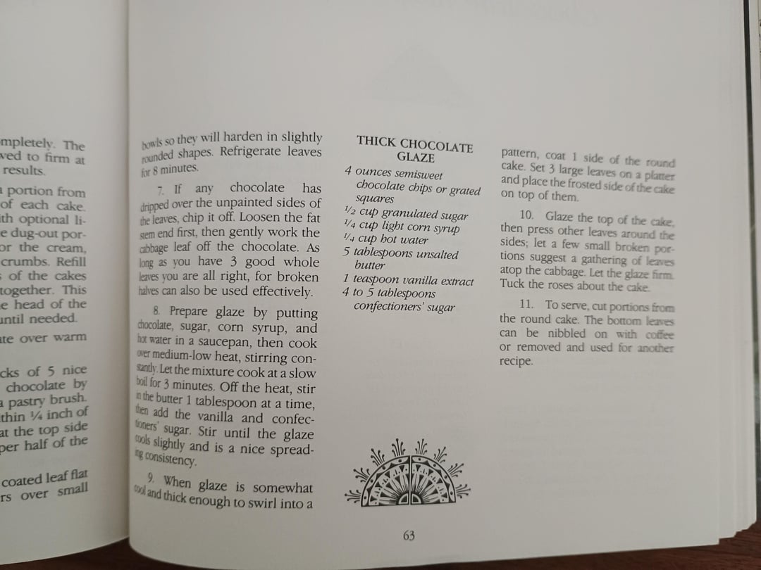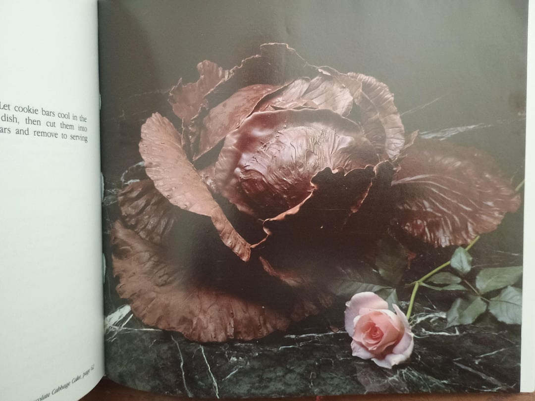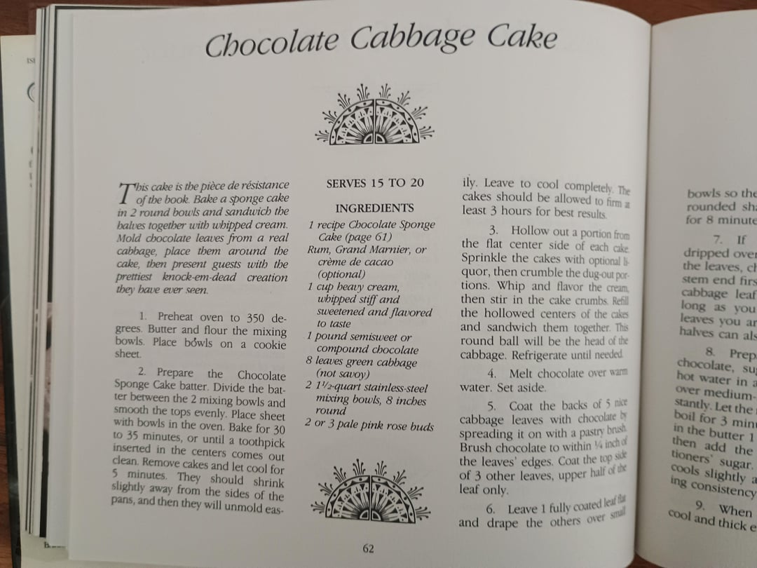 *This cake is the pièce de résistance of the book. Bake a sponge cake in 2 round bowls and sandwich the halves together with whipped cream. Mold chocolate leaves from a real cabbage, place them around the cake, then present guests with the prettiest knock-em-dead creation they have ever seen.*