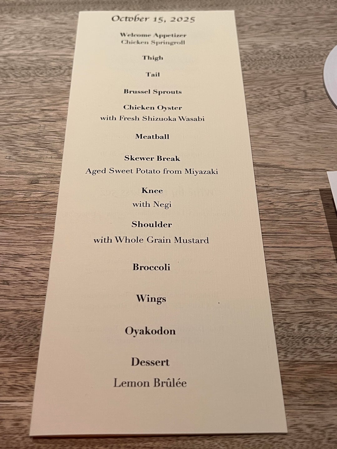 Stand outs were the tail and chicken oysters. Everything was cooked perfectly and the dishes were well paced. We were offered 2 more dishes including items not on the menu (I opted for the inner thigh and another tail). I was worried I was going to need a slice after the meal, but the oyakodon (which was actually pretty large) sealed the deal.