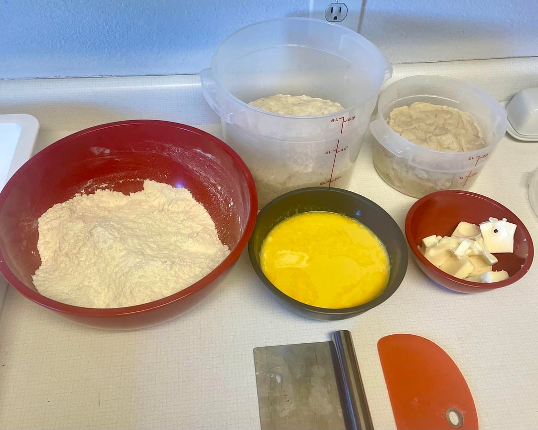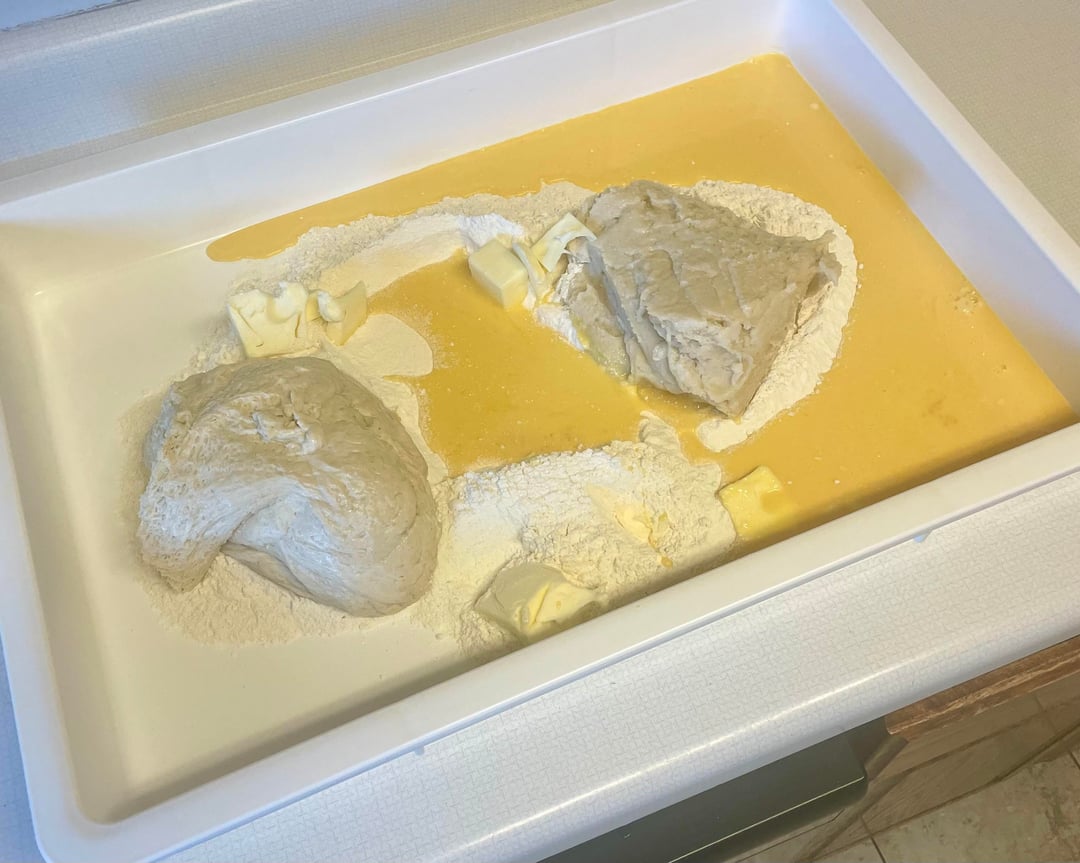 Everything goes into the final mix the next day. The butter is 6.8%, so I just mix it with everything at once. You could arguably mix it in after you develop the gluten.