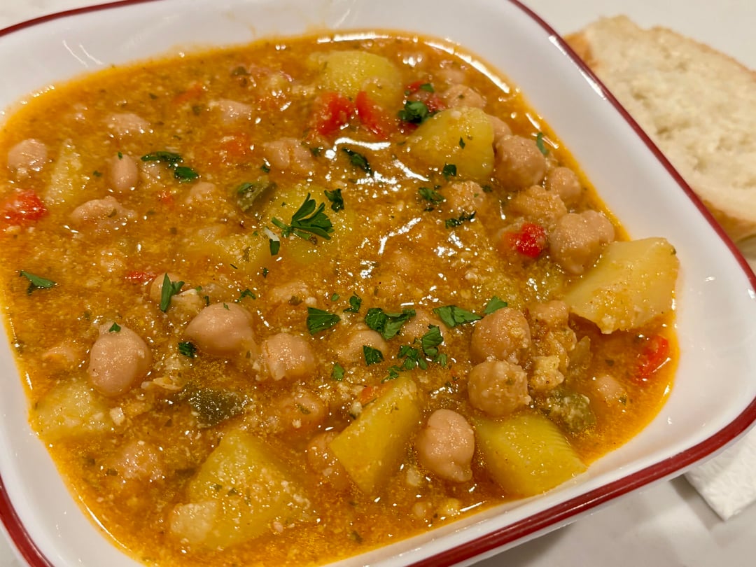 🍜 Dinner: [Garbanzo bean stew AKA Spanish potaje de garbanzos](https://spainonafork.com/spanish-potaje-de-garbanzos-recipe/) by Spain on a Fork (6 servings) -Tripled the recipe and served with bread for dipping/sopping up all that deliciousness. This is SO tasty, a keeper. I recommend using a food processor instead of a mortar and pestle for the thickening mixture (which is delicious as is by the way). I love using gold potatoes in soups and stews. So so good.