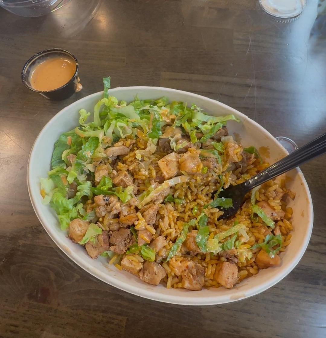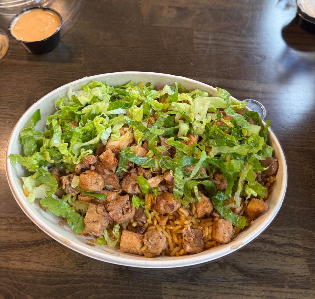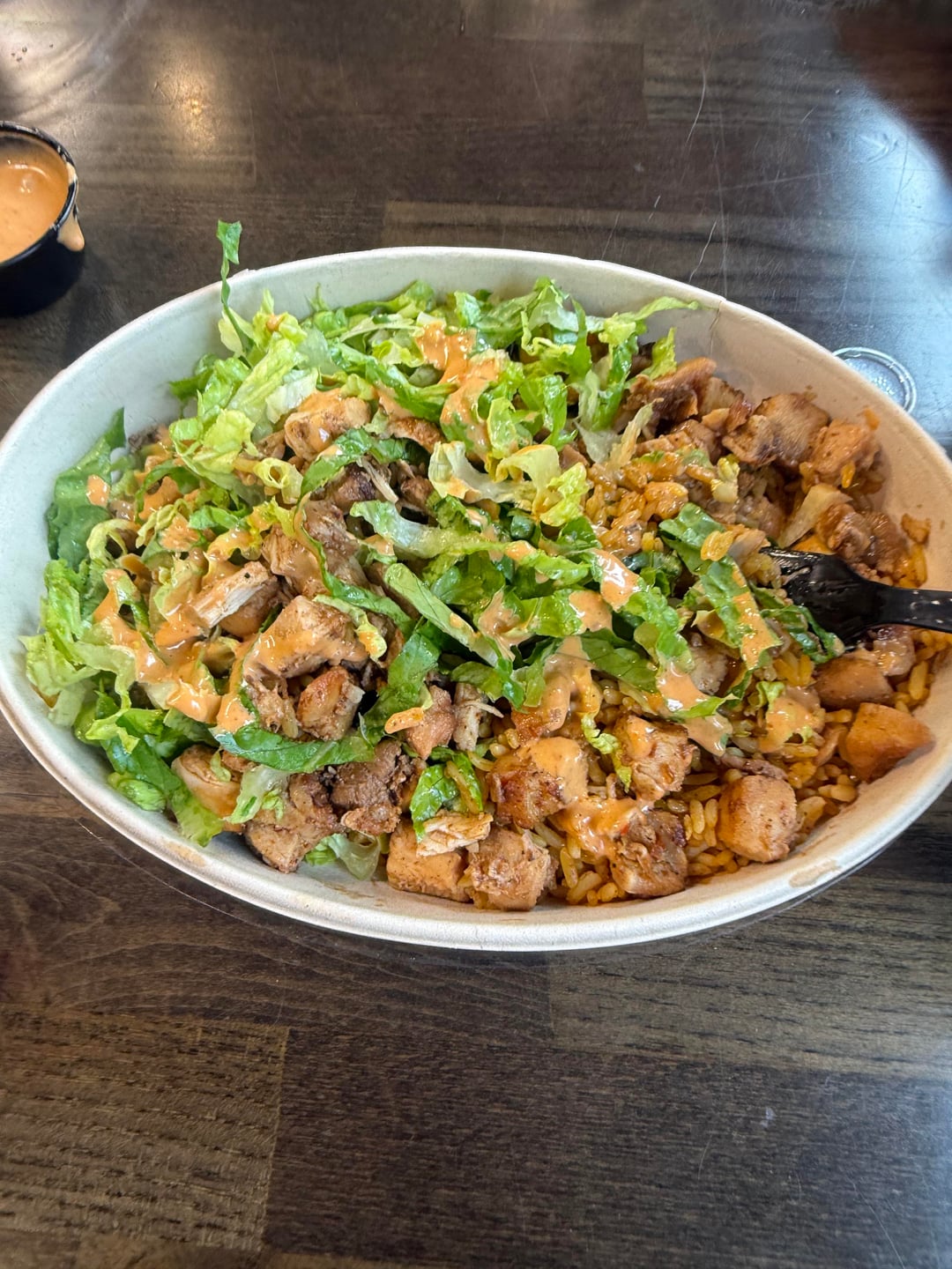 Mexican rice on the bottom, grilled chicken, lettuce and chipotle sauce didn’t use the cup that’s on the side just whatever I drizzled shown in the second pic