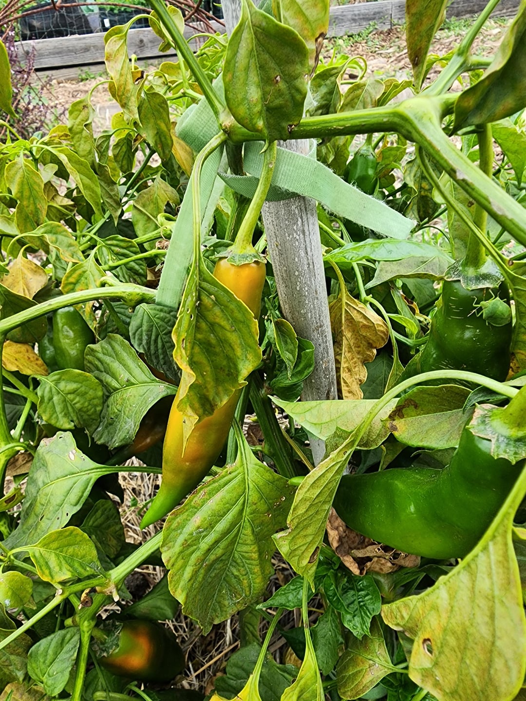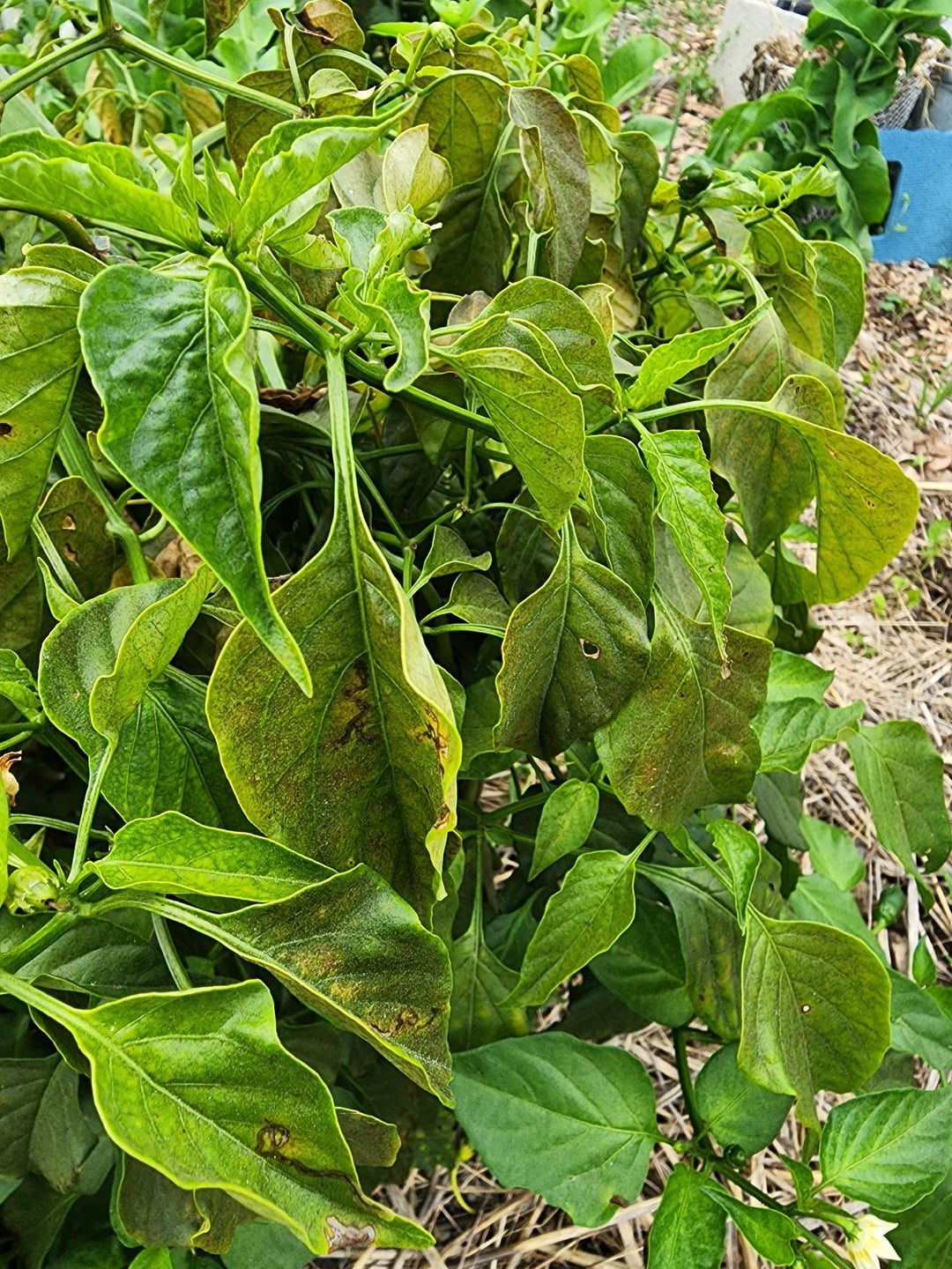 My two ají amarillo plants are starting to look sad, they're drooping a little more, and the leaves are turning a brownish yellow. Any advice? I'm in zone 10 (Southern California), and the weather is cooling down a bit. Plants are watered about once a week, though the soil in this part of the community garden is hardpan a couple of feet under and drainage is not good. However, the plants have been looking super healthy until now.