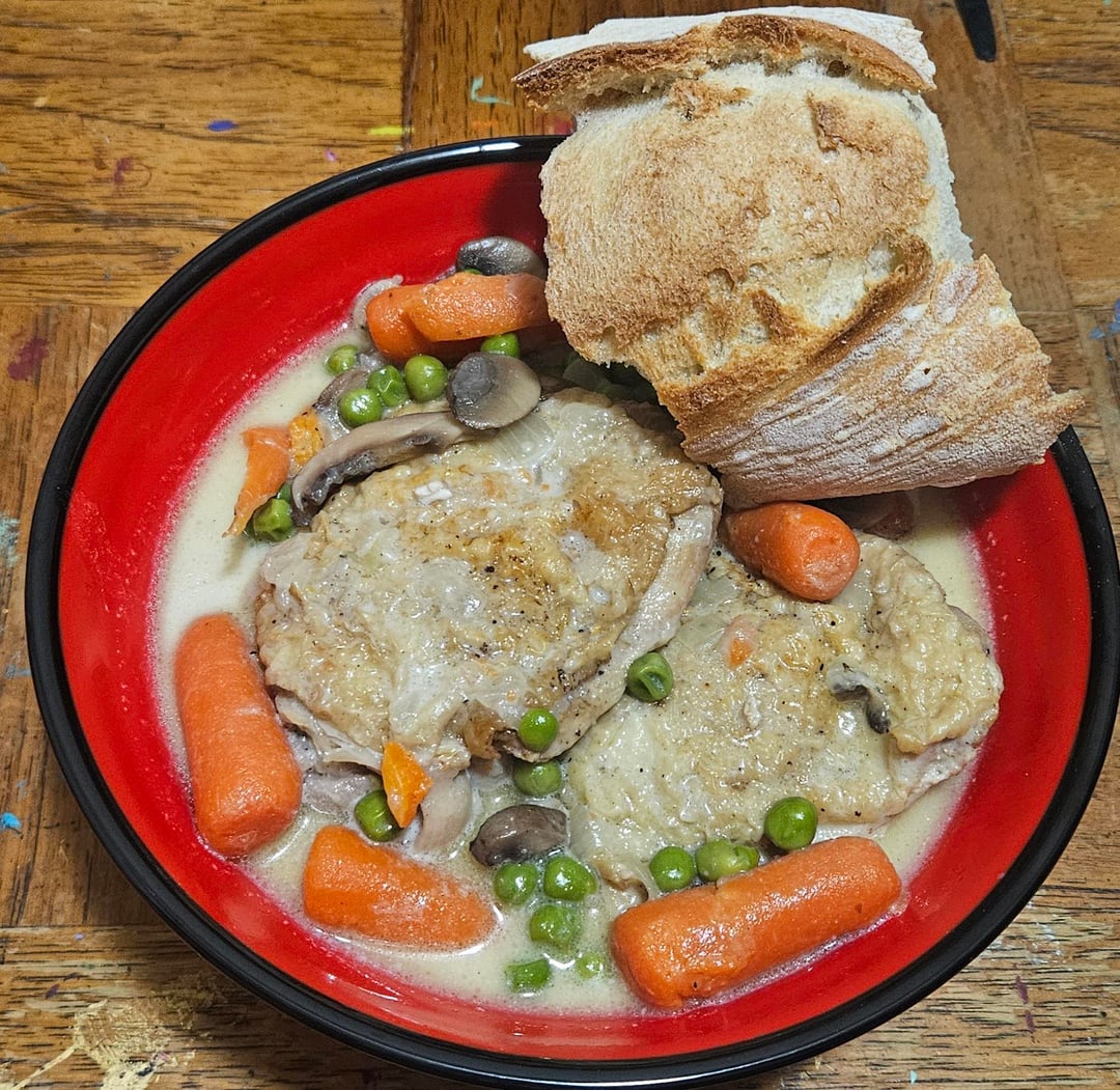 Brown chicken thighs (or whatever piece(s) you prefer), then saute diced onion and sliced mushrooms, add a splash of wine if you have any (I had 2T left in the bottle, so that's how much I user), then put the chicken back, add whatever veggies you have (I had baby carrots, but potatoes, green beans, or whatever else all work well), cover with water (or stock; I used about 3c so it is more of a soup tonight, but use less for a stew consistency, ir thicken with cornstarch) and simmer until everything is tender. Add frozen peas or other frozen vegetables, about 1c cream and simmer until the peas are warmed. Season with salt, pepper and dried herbs if you have any (thyme is my favorite, but I didn't use any), and serve with bread, pasta, rice, couscous, potatoes, etc. You could even make dumplings with just flour, water and salt, and boil them in the soup for 10-15 minutes (depending on size).