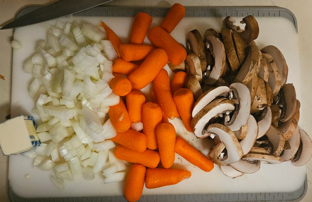 A bag of baby carrots was about $2.50 (I used half of a 2# bag, so $1-1.25 worth), a container of mushrooms was about $2.50 (I don't like the cheaper white mushrooms, but you could save $.50-.75 by buying those), a couple small onions from a 3# bag amounted to probably $.50, 1/2 of a pint of cream was probably $2, and the chicken was about $7, and I even used Smart Chicken. I did buy a nice loaf of bread for $6 from a local bakery, but you could use a package of dinner rolls or a cheaper loaf of bread. Total, without the bread, was around $13.50 and it makes 6 servings, assuming everyone has one piece of chicken (my package had 6 pieces). You could further spread it by adding quartered potatoes and pulling the chicken out and shredding it before serving, in which case I imagine you could feed as many as 8. Use a $1 bag of rice and you could make a large meal for ~$15.