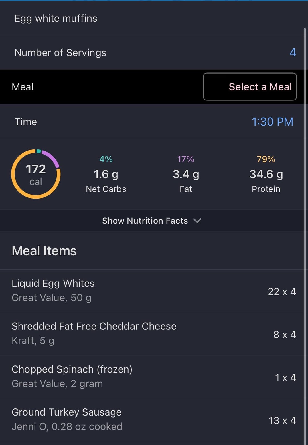 Egg white, turkey sausage, spinach and cheddar muffins. 172kcal for four. 34.6g protein.by Raccoon_Virus7180 4 Comments AValeria10 2 months ago Looks good Did you thaw the spinach first? Or did you just mix it all up while it was frozen? Low_Bite_3936 2 months ago These look delicious! bgcbbyckes 2 months ago interested in this recipe~! InstrumentKisser_2 2 months ago ooh, i might try these! been trying to find a way to get more spinach in my diet after having a bad reaction to my iron supplements