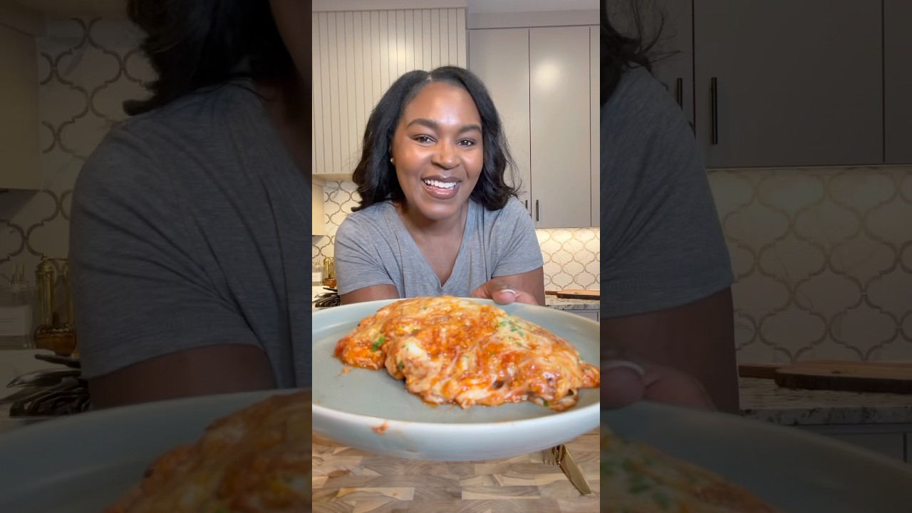 This super cheesy chicken parmesan was absolutely amazing. So, we’re starting out with some thinly sliced chicken breast. We’re going to pound those down and make them even thinner. So, we’re going to start off with some olive oil, some black pepper, a little cavender seasoning, some smoked paprika, some onion powder, and garlic powder. We’re going to flip them over, and we’re only going to add some onion powder, garlic powder, and some smoked paprika. We’re going to add those same seasonings to our flour. We’re going to crack open three eggs and add maybe about 2 to 3 tablespoon of milk. Just going to mix that up. And we’re going to use the Kinder Parmesan Plankco blend. We’re going to start off in our flour. We’re going to dip it in our egg mixture. Get that nice and coated. And then into my Planko blend, I’m just going to press down and just sort of sprinkle those crumbs on the top. Now, once you do that, you want to set these in a baking sheet. You want to line it, but mine were resting on some cake pans. So, we’re going to pan sear these just to get some nice color on them. And that’s it. We did that for about 2 3 minutes on each side. I added a pad of butter. Put them in the oven on 375 until they were perfectly cooked. So, I’m going to shred some parmesan as well as some mozzarella. We have some butter and I added some fresh garlic with a little tomato paste. I roasted that garlic. It smells so amazing. We’re going to use about a cup of your favorite pasta sauce. I’m seasoning it with some garlic pepper as well as some Italian seasoning and a little salt. So, we’re going to add down our parmesan and mozzarella cheese. We bake this in the oven until it melted nice and smooth. Just like that. When I tell you absolutely amazing. Pair this with some butter