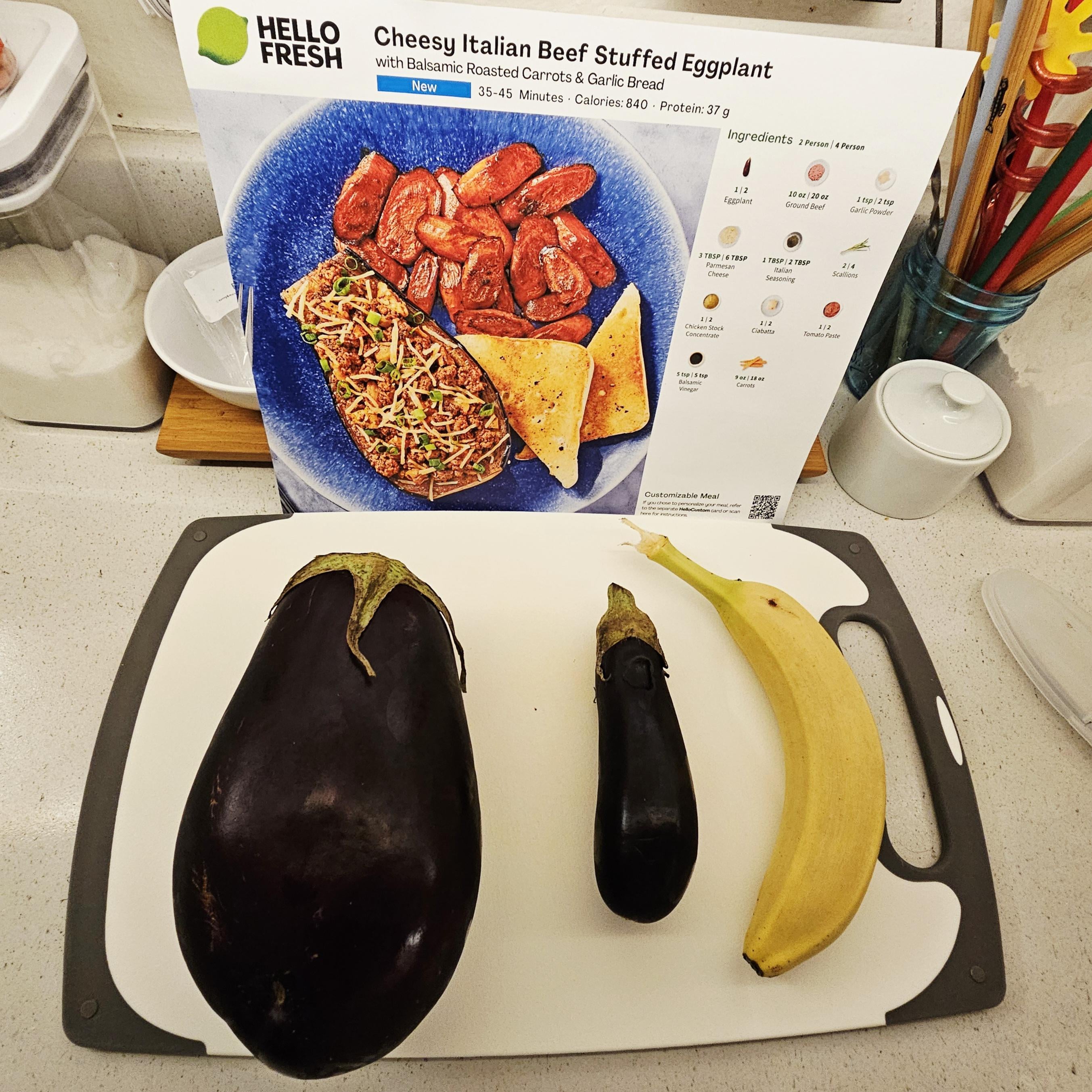 Sorry to be that guy, but this had me cracking up (and a little pissed off). So, I opened up my bag and thought they left the eggplant out, but it was just hard to notice. The one in the middle is the one they sent, the one on the left is what I just picked up at the grocery store. Banana for scale. Basically, imagine trying to stuff half of a small banana with a bunch of shit 🤣 Each individual carrot they sent is larger than that little guy. Beware of this recipe I guess!