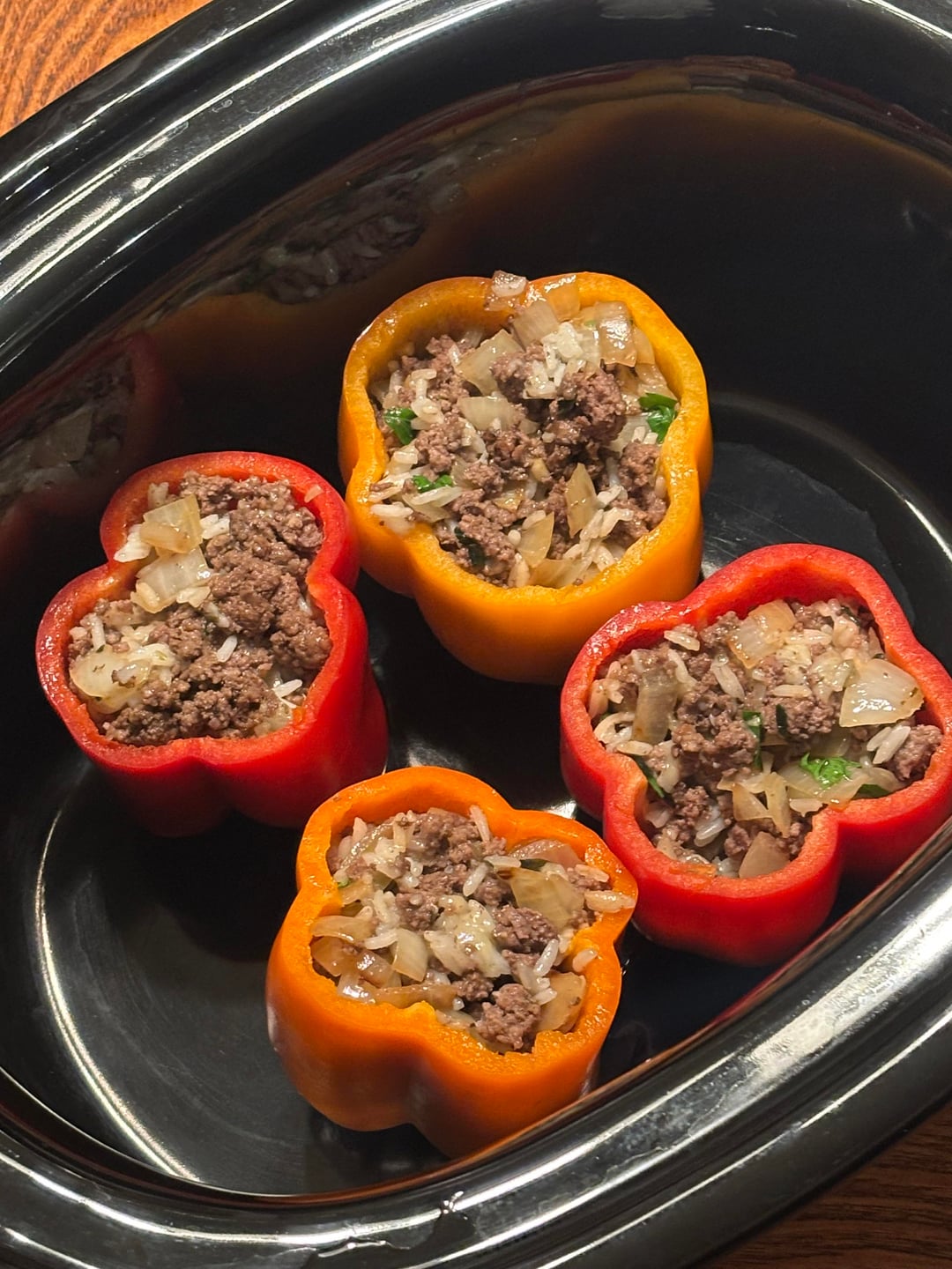 Once cooked combine meat with chopped fresh basil and parsley, about 1/2 cup rice, and a good amount of the grated Bellavitano and Gouda. Fill the peppers. Put in the slow cooker with 1/2 cup chicken broth in the basin.