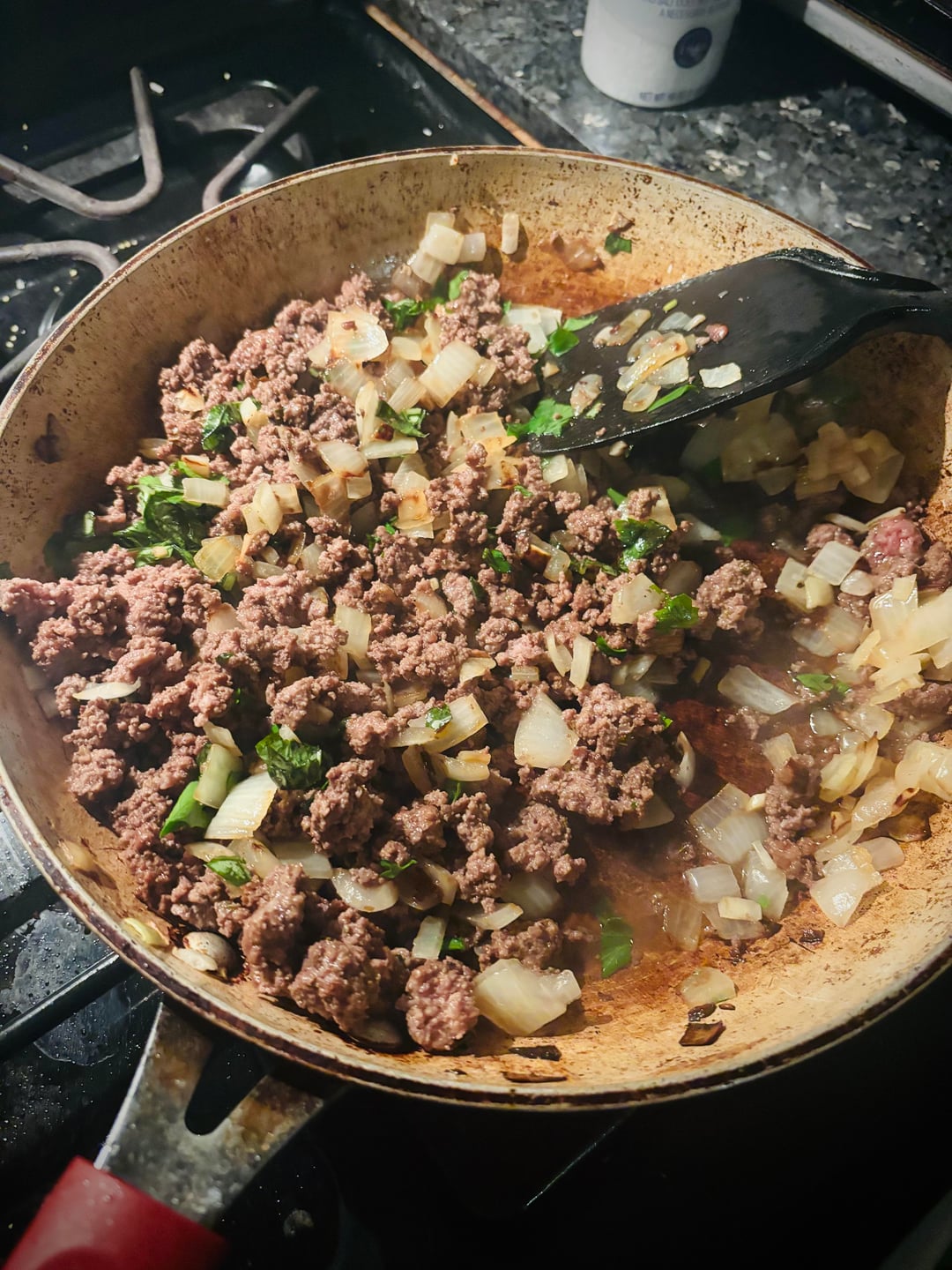 I used a chuck and brisket beef mix, fresh basil, fresh parsley, and three cheeses: Bellavitano (you could use another firm cheese like Parmesan), a nice Gouda that was on sale, and Port Salut. Also a small yellow onion, 2 cloves garlic, salt, pepper, and dried oregano, a pinch of chili flakes, and chicken broth. I also made a cup of rice while I was prepping my ingredients.