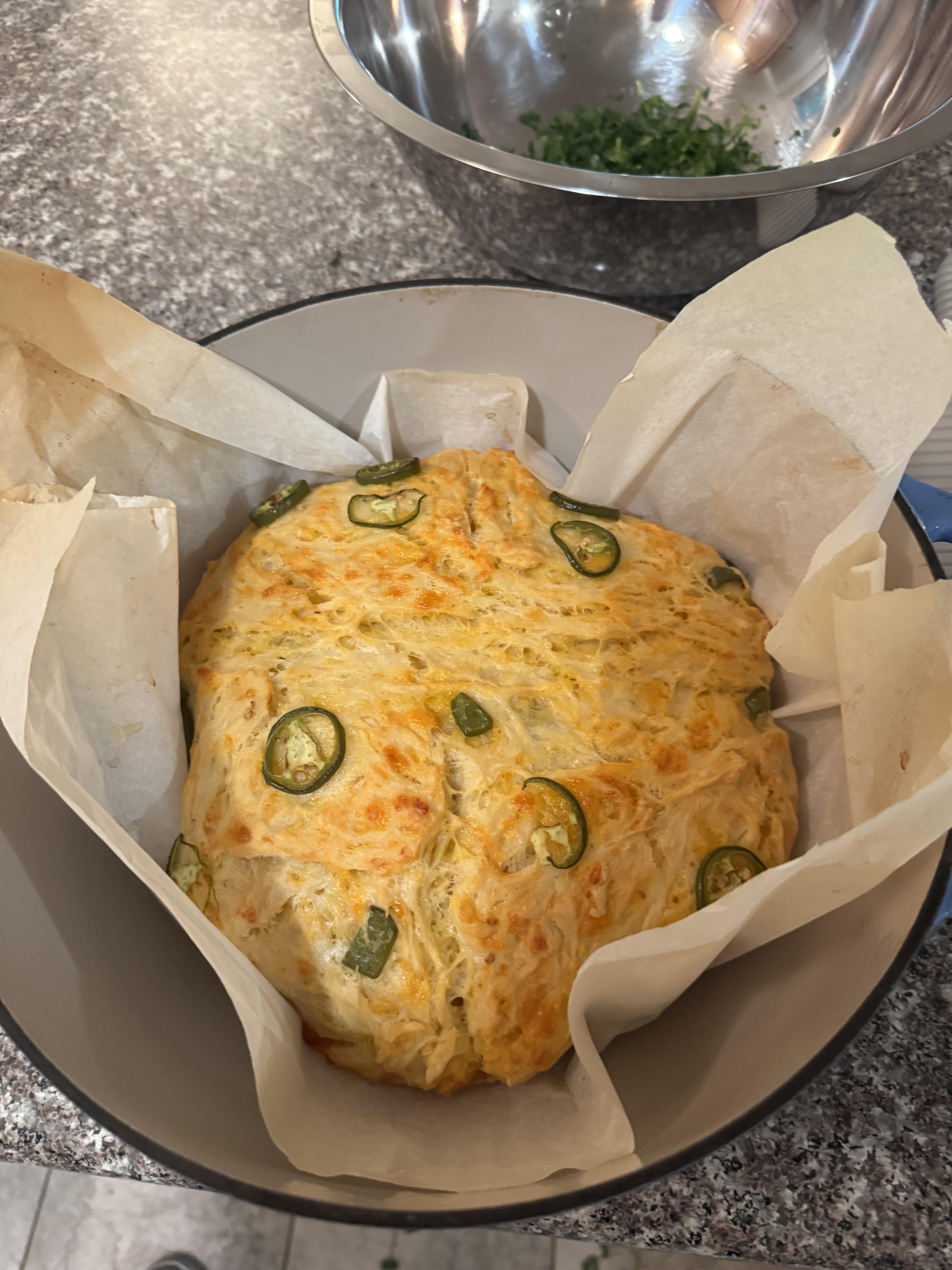 Preheat oven to 450, throw your Dutch oven in to pre heat Combine your yeast and water and let bloom, Separate bowl, add all your dry ingredients Combine them and let rise for an hour or so Fold the dough over 8-10 times, make a nice ball and let rest for 30 more min Toss it in a preheated Dutch oven, and into the oven for 30 min with lid on Take out and add some more cheese and peppers on top, bake uncovered for another 15-20 min