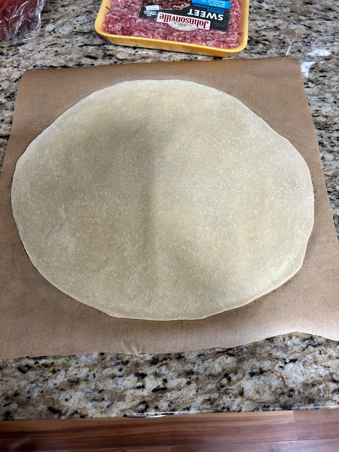 I see you drying it out on the parchment. Thats what I like about this pie. No hand stretching. Just roll it out . And I love the crunch.