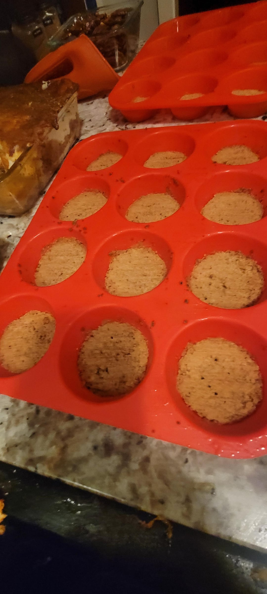 Went for my silicone muffin pan/mold with a little avocado oil sprayed to be safe (recipe + my tweaks made 2 dozen almost perfectly). Pressed my crust crumbles in the form and fork poked as directed, but went with a little more time for toastyness (maybe 8 mins?)