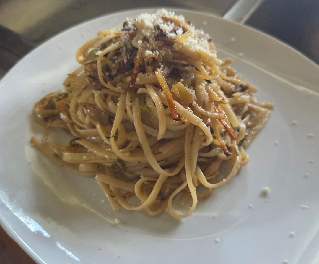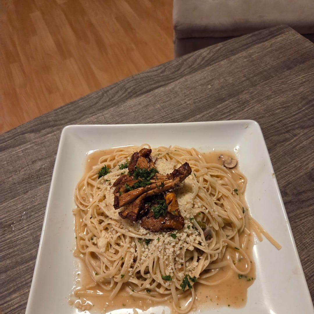 I made the sauce by pasting half a head of garlic with large grain Himalayan salt, then sautéed in olive oil. I seared the chantrelles in the garlic oil, removed them to the broiler, then added thinly sliced crimini mushrooms and 1.5 to 2 cups of btut champagne. I reduced the wine until it was reduced by at least half of the volume and smelled much less alcoholic. At that point, I reduced the heat to the lowest setting, then added in capers, mushroom stock, preserved lemon and the brine from the preserved lemon. After simmering the sauce base, i removed the pan from heat and added chunks of frozen butter stirring constantly until the liquid base and fat were consistently emulsified. Next, I added some chopped parsley and basil, tossed the cooked linguine in the sauce, then served with the garlic roasted chantrelles.