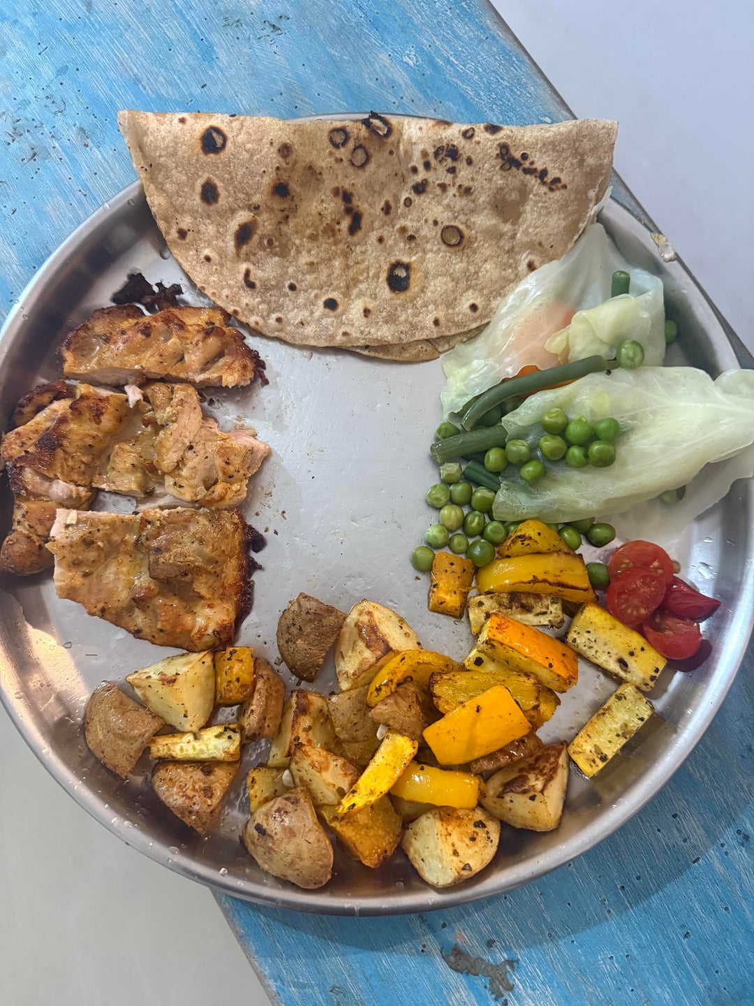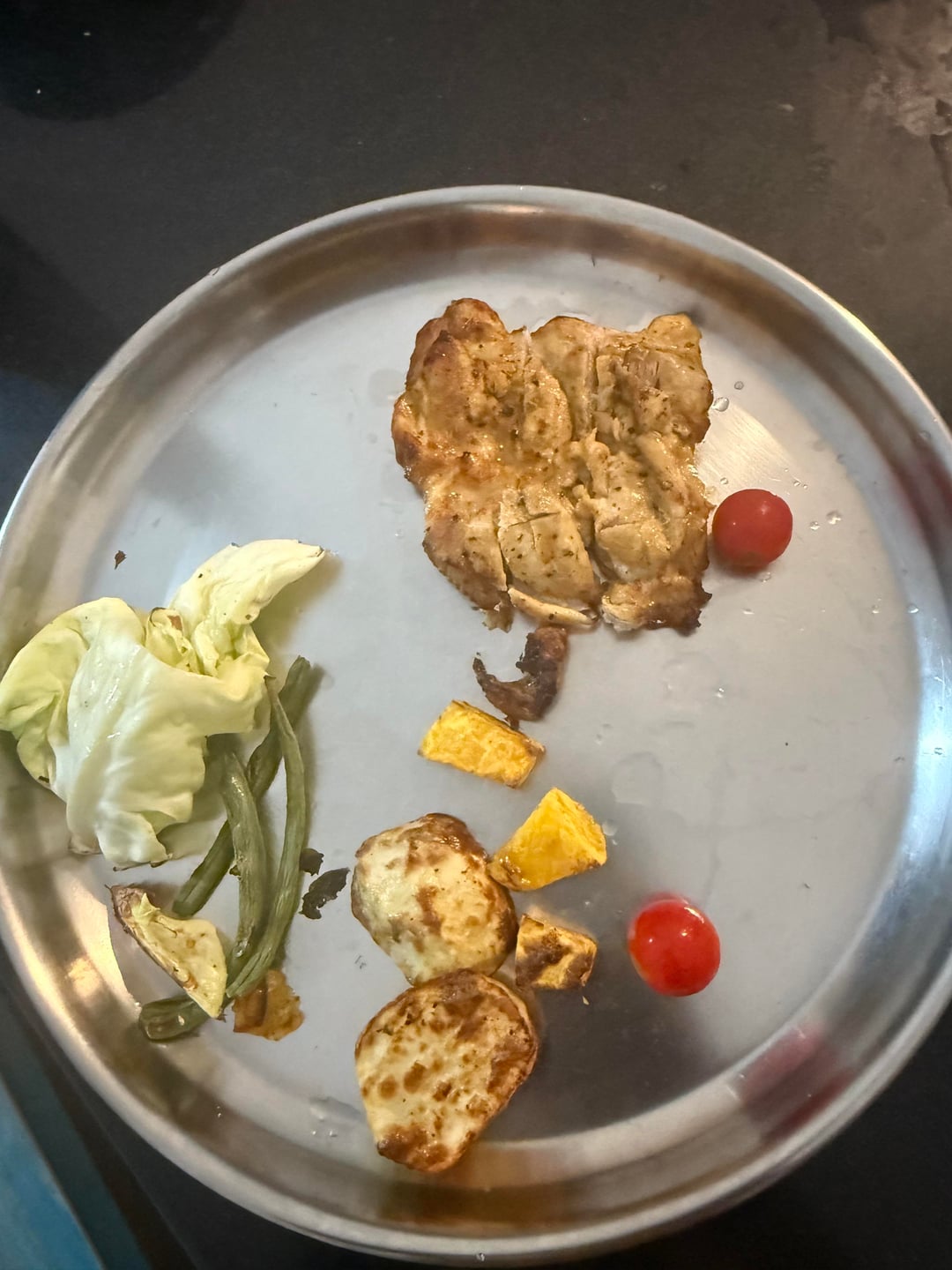 • 200 g boneless chicken thigh (air-fried) • Potatoes, zucchini & Bell pepper (air-fried) • one chapatti • Mixed steamed vegetablesby Odd-Rule-8345 Dining and Cooking
