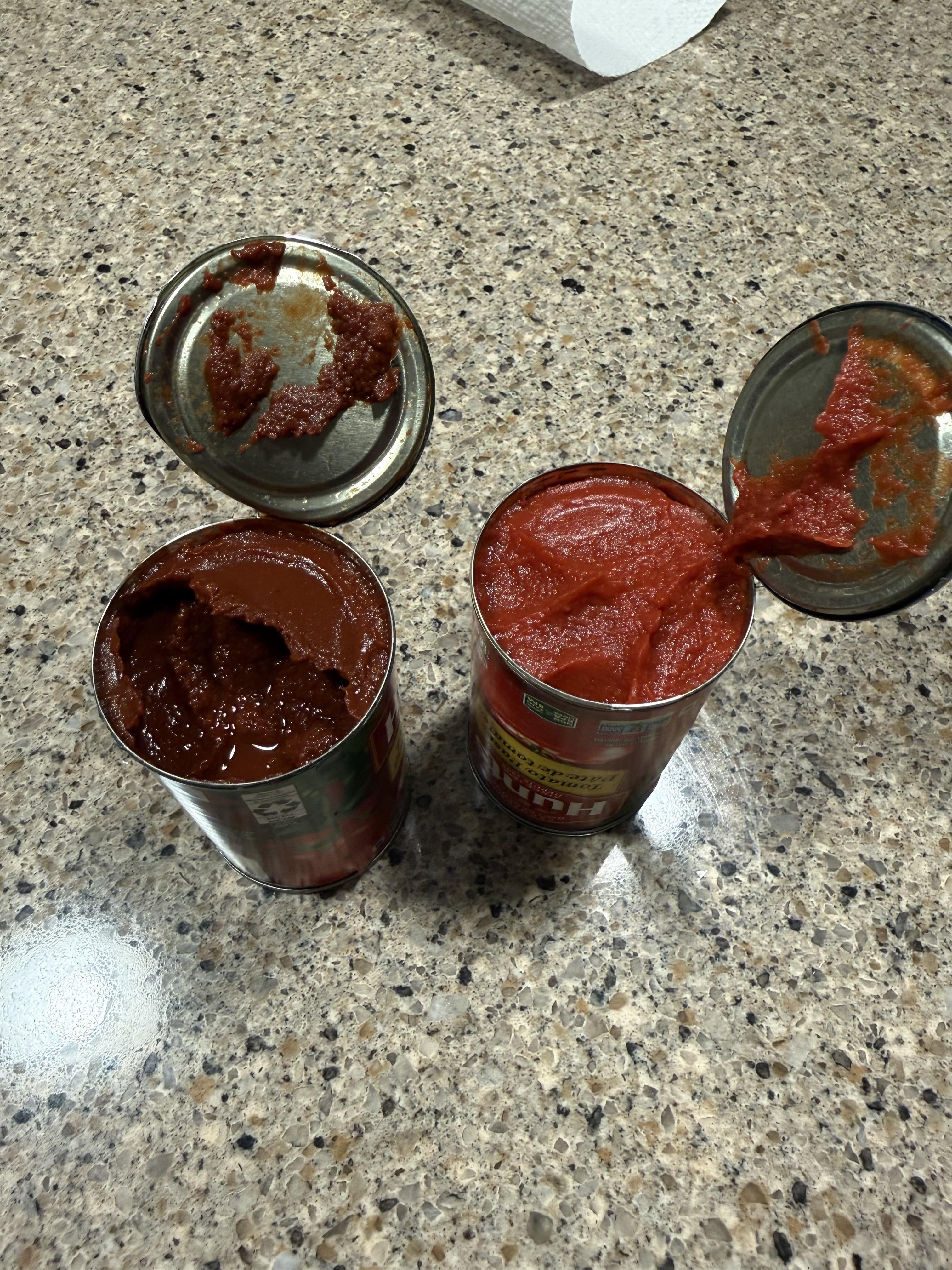 Hunts tomato sauce has become crap. We recently bought a bunch of cans (June 2/2027 date) as we use them in spaghetti sauce. But the can on the left is what the entire lot of six looked like … next to the last can from our previous (good) batch. The can on the left is more brown than red and smells bad. The can on the right is what we’ve always bought and has little odour to it. We threw out 6 bad cans and won’t buy this brand anymore. Shame on you Hunts.