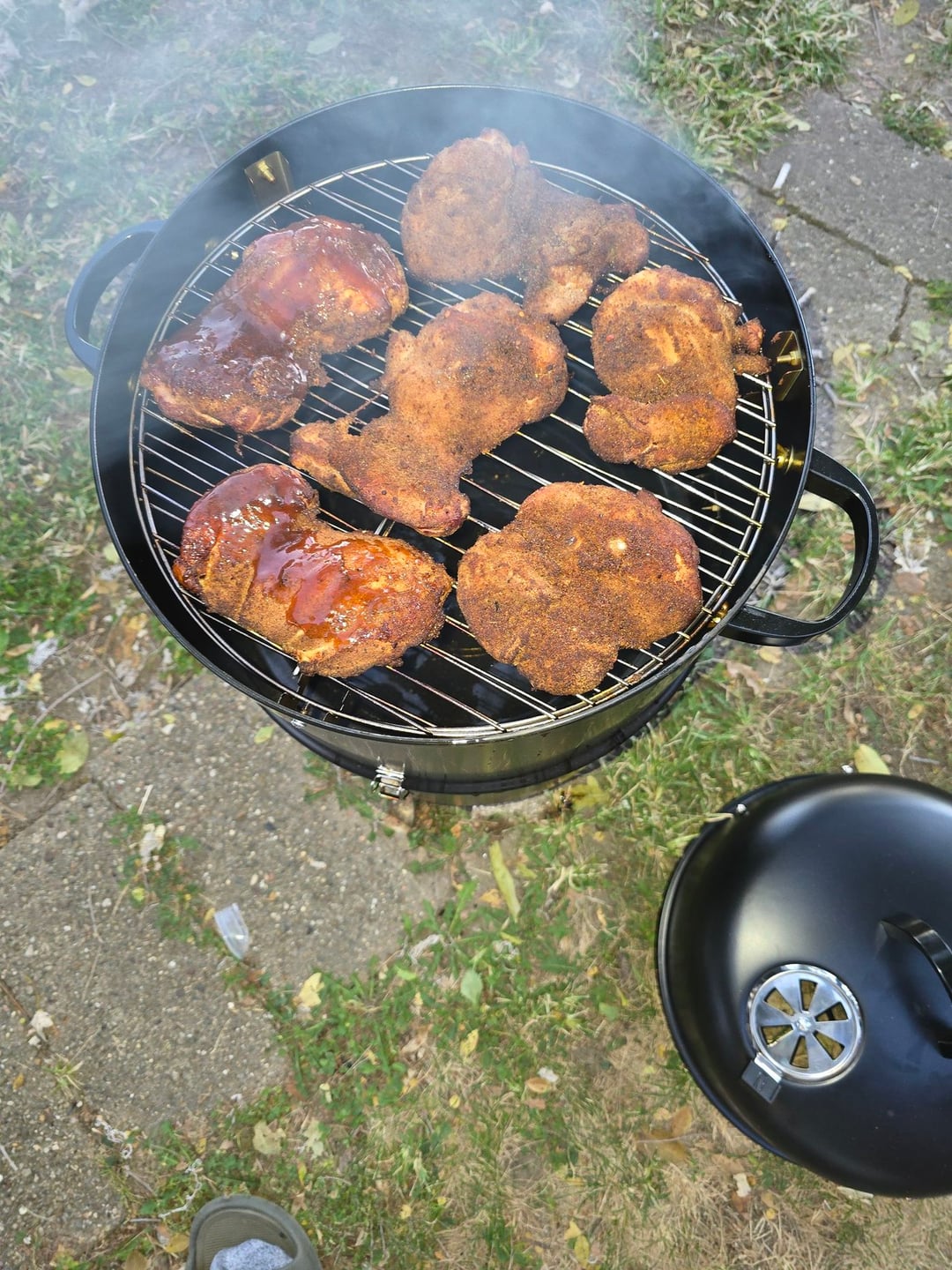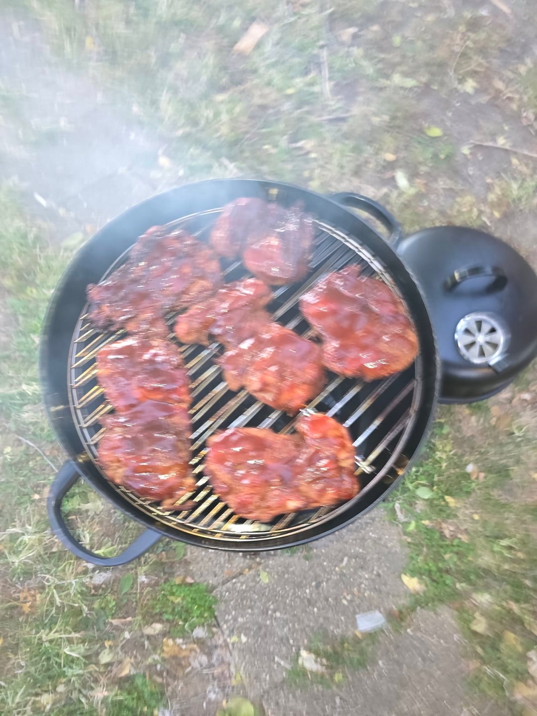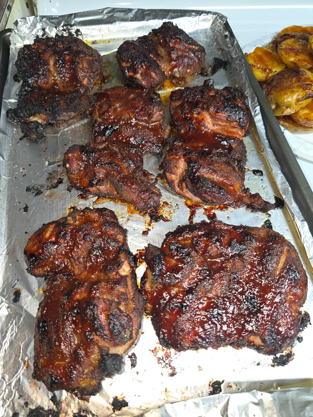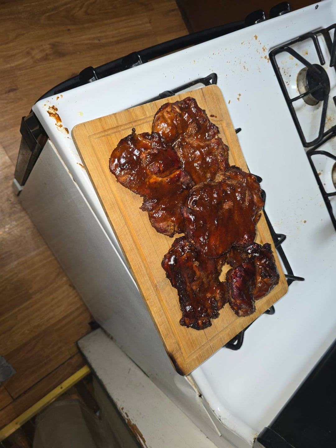 At 2 hours i reached 150 internal so I coated with a apple bourbon bbq sauce that I had thinned with apple cider vinegar. I randomly decided to do 10 minutes under smoke and then transferred them to the oven on broiler high for 8 minutes. I had an internal of 170 and the sauce had caramelized well.