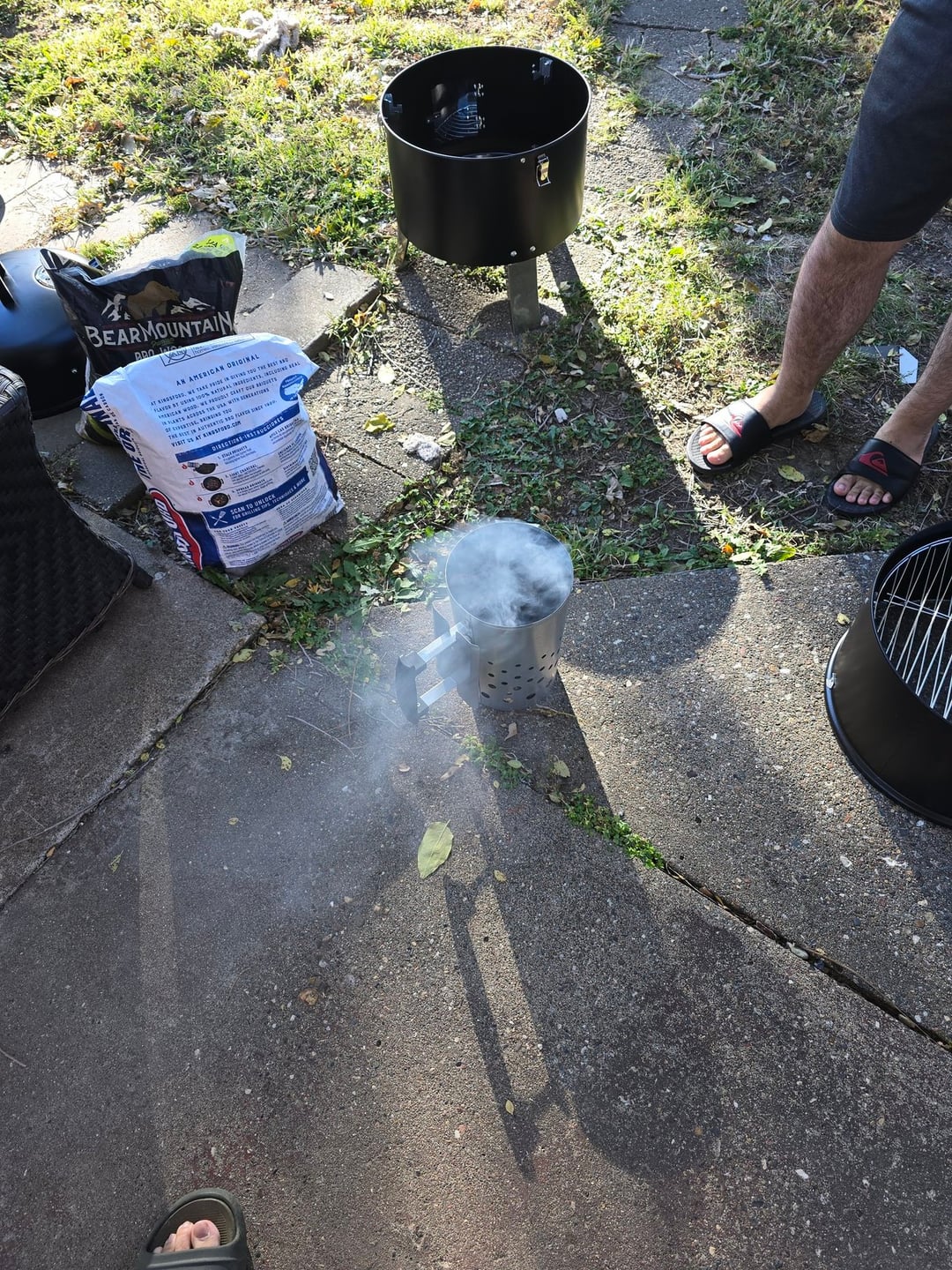 Because the grilling season was done my options at he store were limited for fuel so I was left with kingsford briquettes and bear mountain applewood pellets. I loaded the bottom with a full chimney starter that mostly filled the bowl but added a couple of handfulls of briquets to top it off. I added the other stages including the water tray and waited till the temp read 245. The access door is barely big enough to fit a hand and had to use a folded paper plate to scoop in a couple handfuls of the pellets at this time. I will use a gardening trowel in the future.