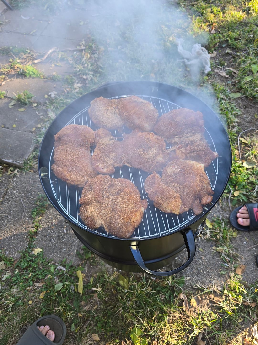 My dry rub was primarily onion and garlic powder 60% volume and brown sugar about 20%. The remaining 20% was various spices in the rack like salt, black pepper, ginger, cumin, paprika, bayou blend, chili powder and even a little birria blend. While I didnt follow anyones recipe and didnt have a game plan for this part I am comfortable eyeballing spices for most meals I cook. I put on a heavy coat and let open in the fridge for 2 hrs.