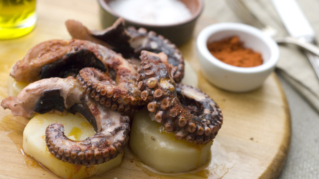 - When octopus is tender, remove it and drain. Put potatoes on a platter and cut octopus into pieces (again, a scissors is easiest); top potatoes with it. Drizzle all liberally with pimentón, olive oil and coarse salt, and serve hot or warm.