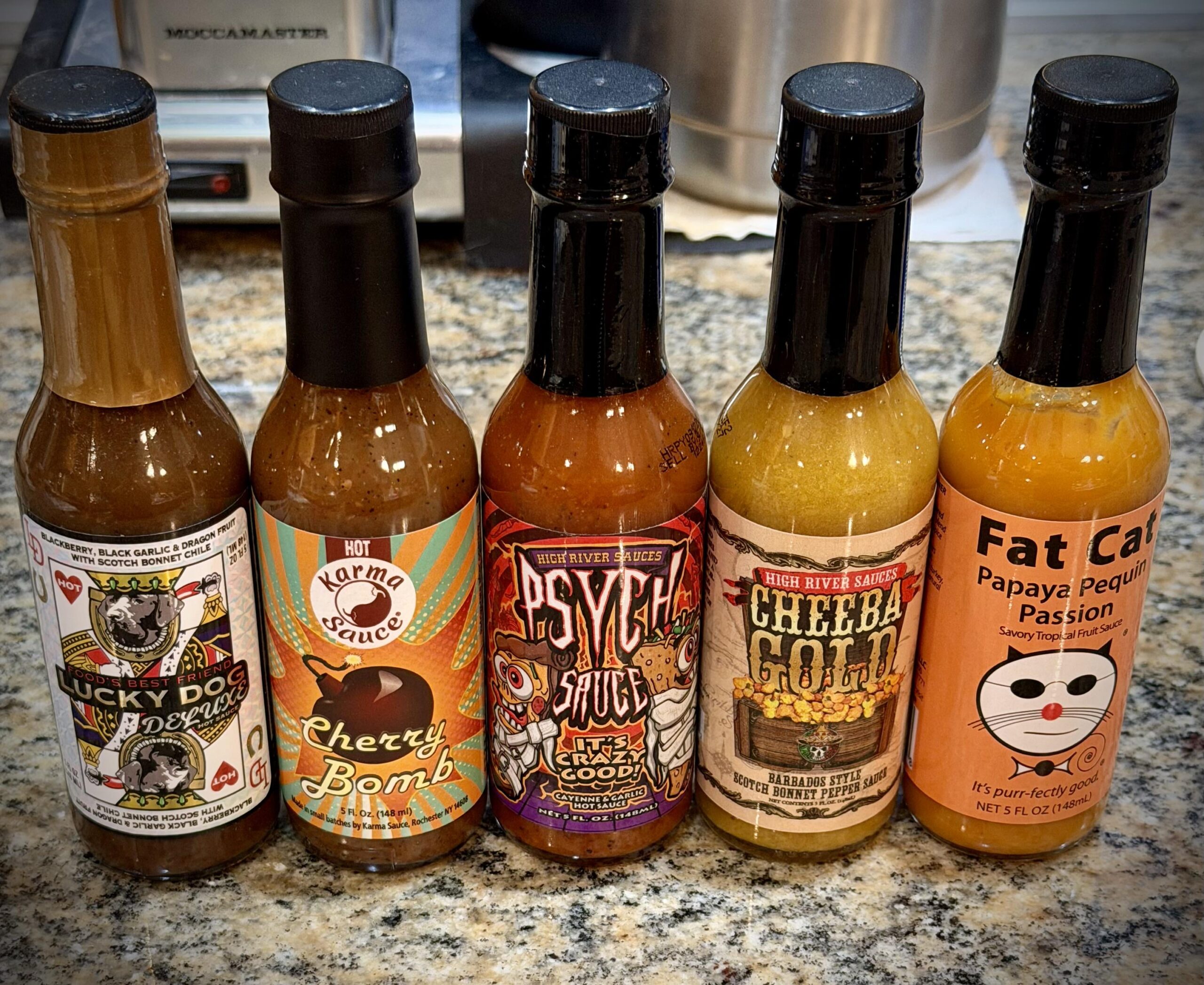 I’ll be taste testing Psych Sauce, Cheeba Gold, Tears of the Sun, Thunder Juice, and Peppers Up while interviewing him.
