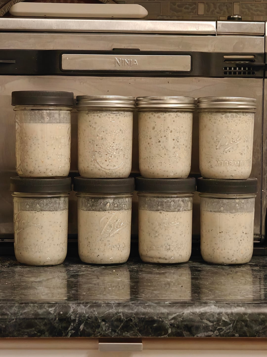 Breakfasts are overnight oats. Oatmeal, protein powder, chia seeds, Greek yogurt, almond milk, and no sugar syrup. 385 calories, 8 g fat, 39 g carbs, 36 g protein