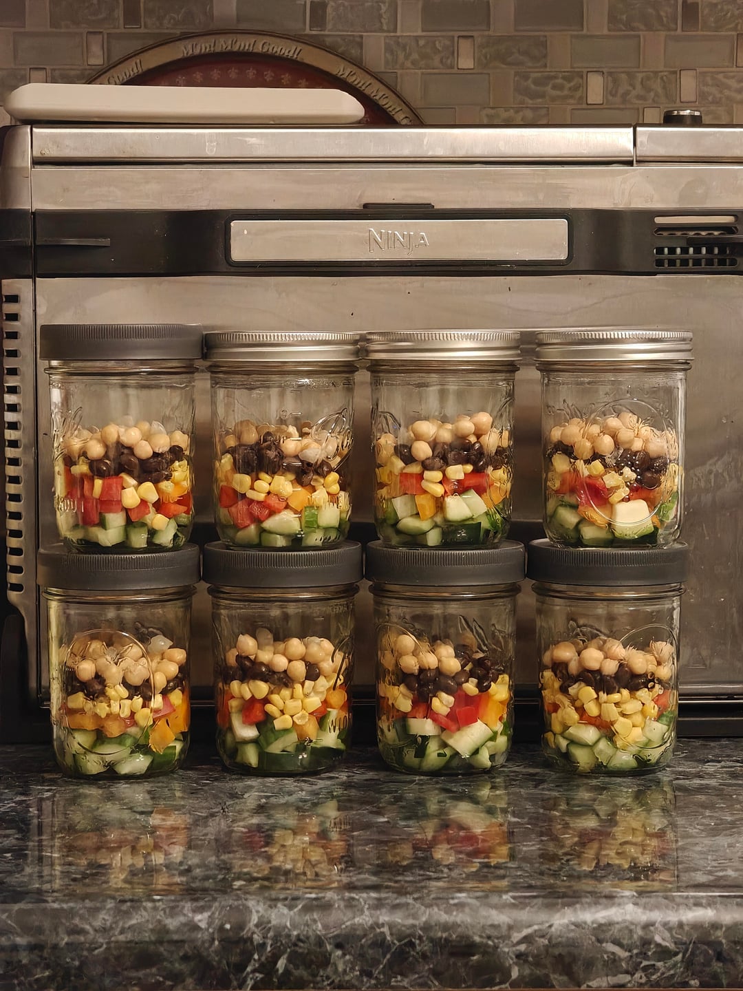 Dinners are salads. The jars have cucumber, zucchini, bell peppers, corn, black beans, and garbanzo beans. There are also hard boiled eggs and chicken breasts in vacuum sealed containers. I'll add some spring mix, almonds, sunflower seeds, dried cranberries, and homemade cilantro dressing when putting the salads together each day. 375 calories, 29 g protein, and I haven't calculated the carbs or fat.