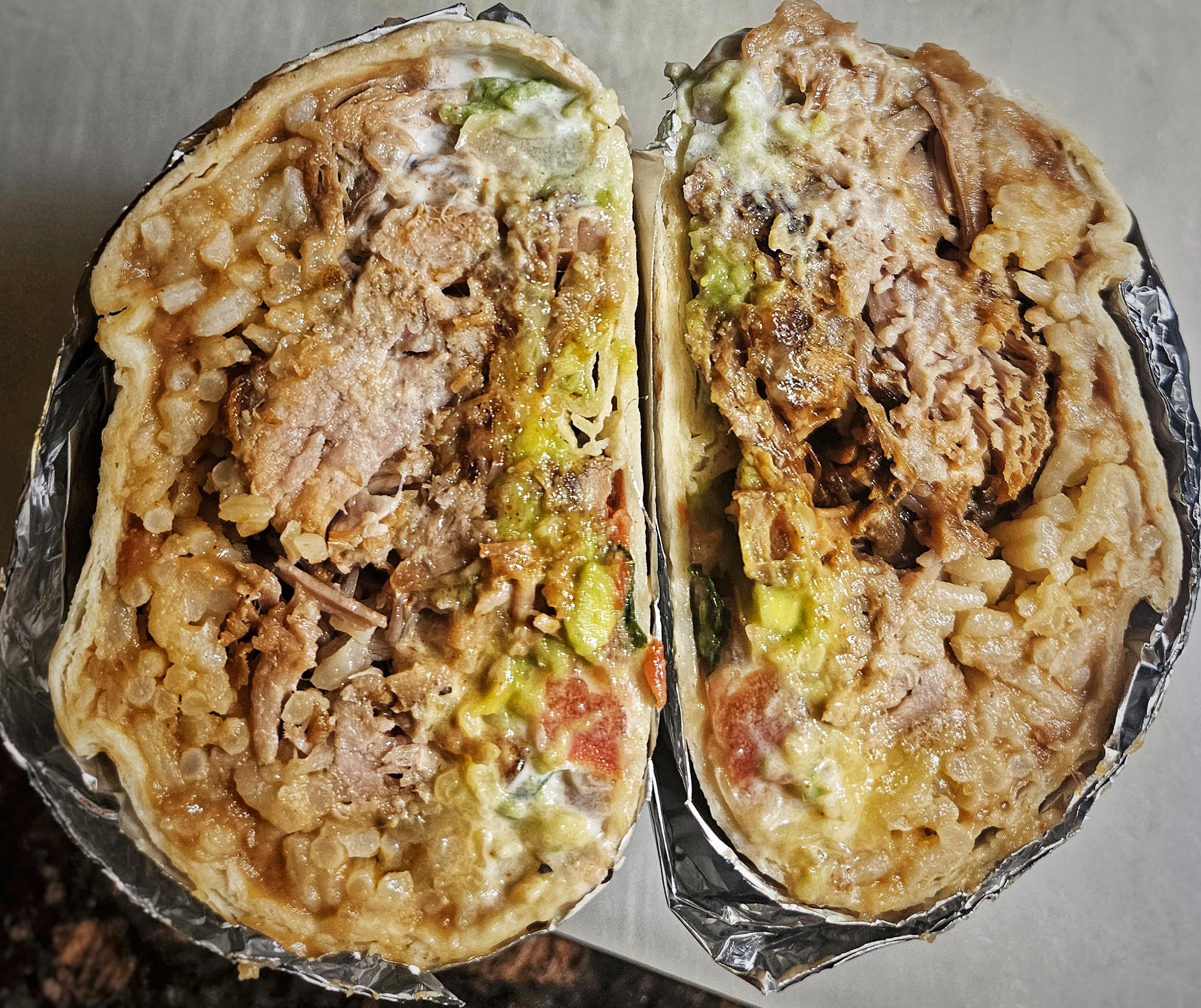 Homemade carnitas burrito