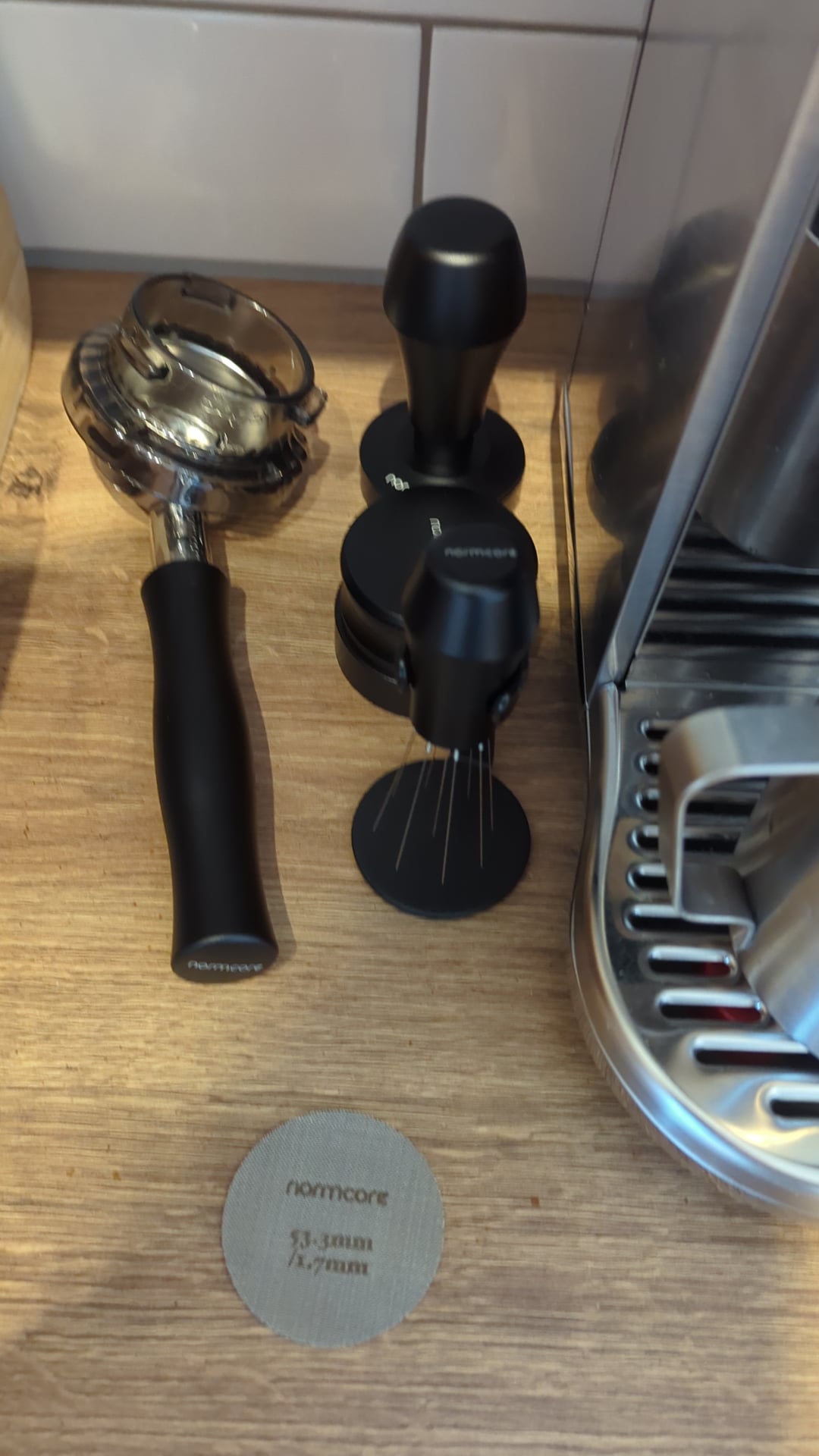 I have the following accessories: – Normcore self levelling tamp – Normcore WDT – Normcore wedge distribution tool – Normcore bottomless portafilter – Normcore 1.7mm puck screen – Sage funnel – IMS basket (26E) – Timemore black mirror nano scales