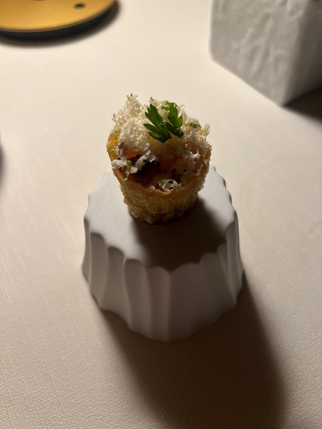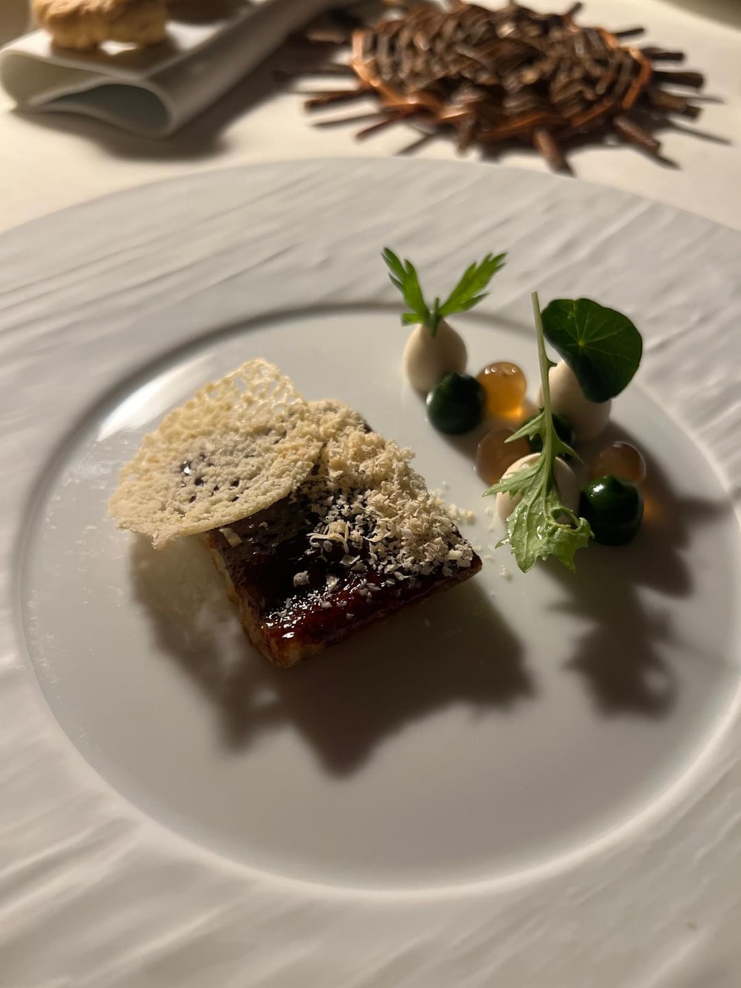 +Eel "yakitori", almond tuile & snow, tosazu, tarragon. Served piping hot, cloud-like softness. The sauces cut through the thick glaze and cooled down the temperature (as intended). Enjoyed the peppery and minty flavors from the tarragon, nuttiness from the almonds. Fun balanced dish.