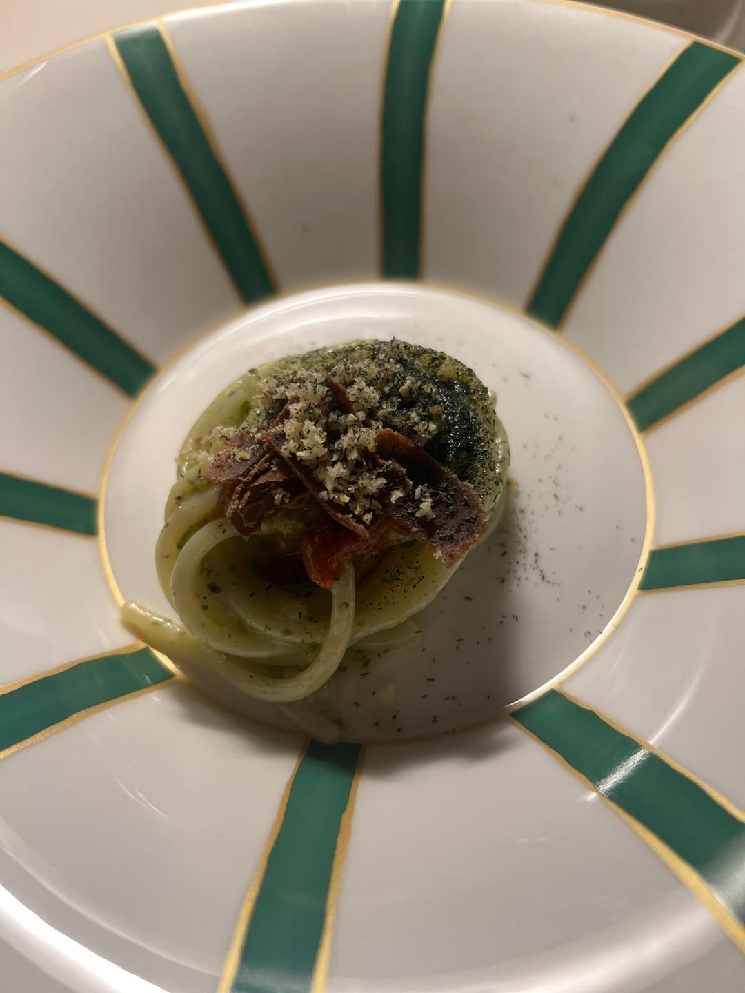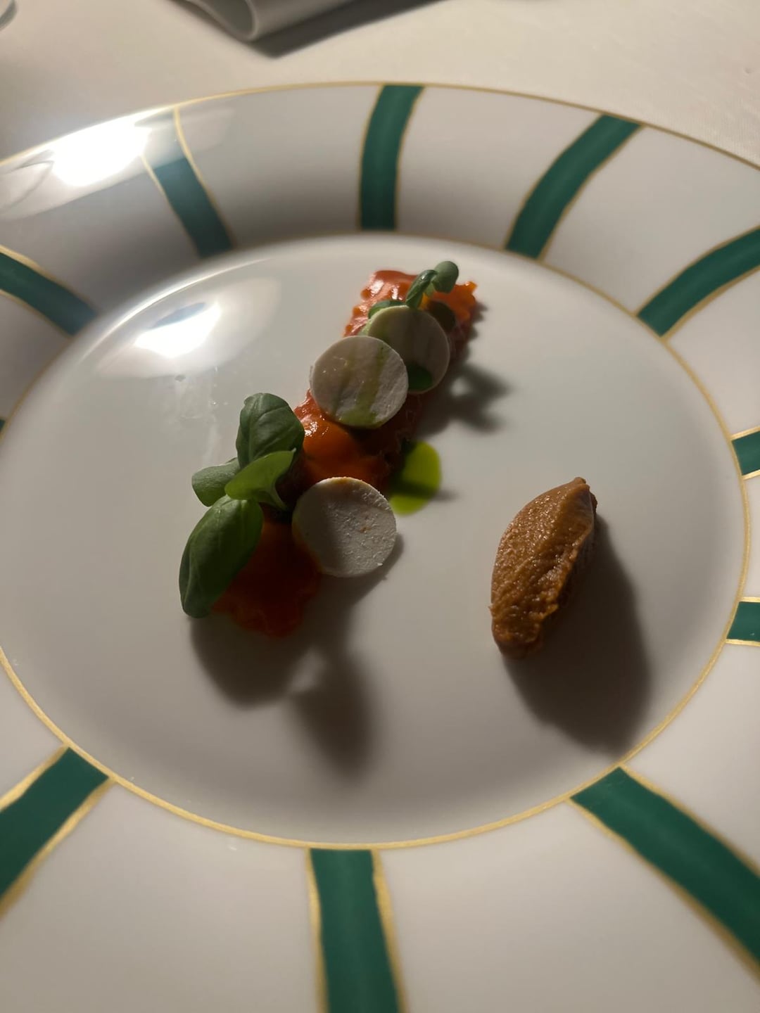 ~Riccota ravioli, ragout, basil. Modern presentation of chef's family recipe. Tastes the same as you'd expect anywhere, the only difference being the ragu was made to have a smooth but pasty consistency – just think of ragu scraped through a sieve.