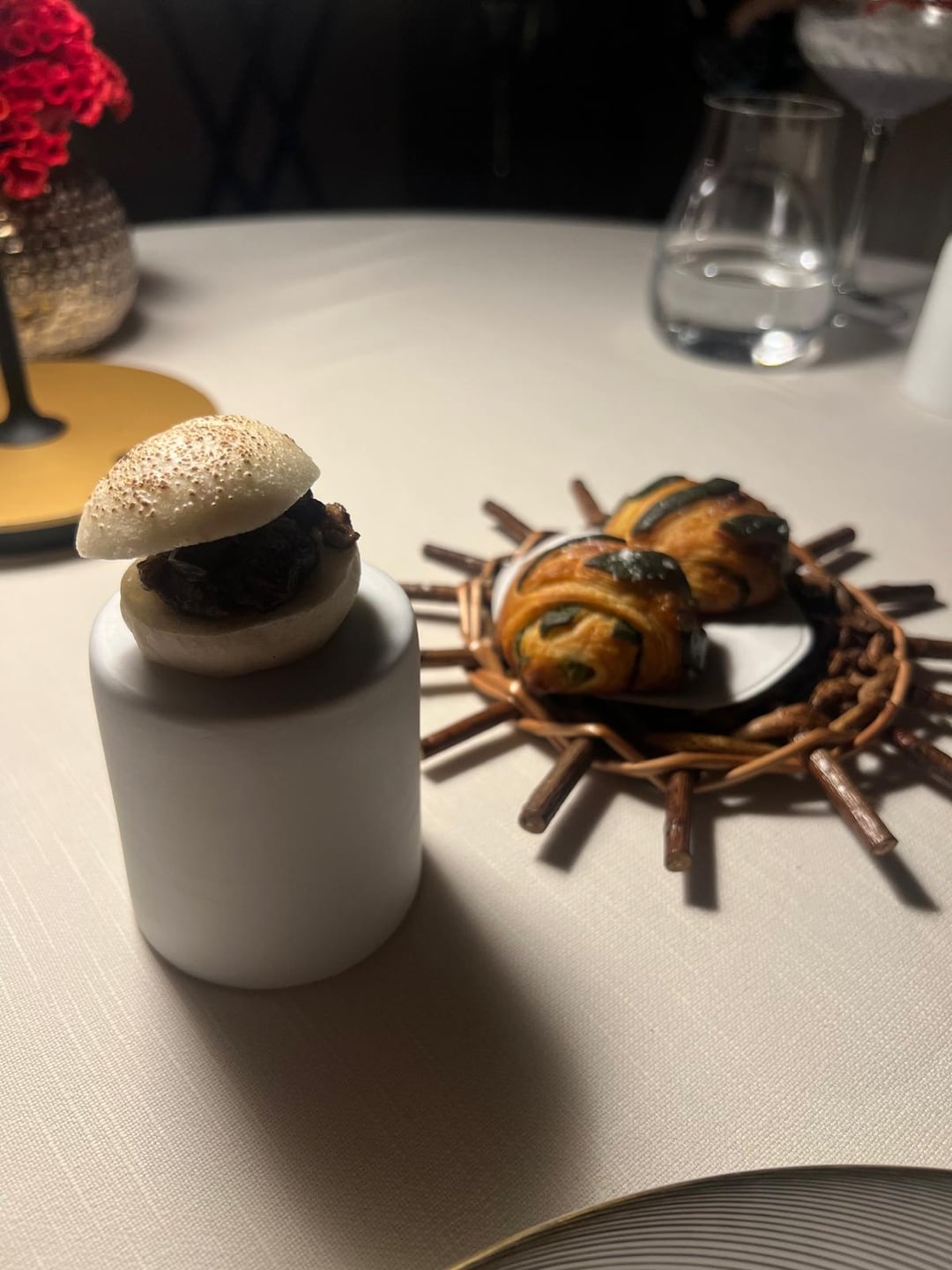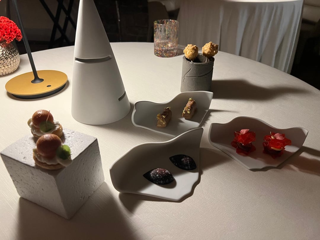 olive cigar, cream cheese, yuzu gel; smoked tuna, horseradish; chicken liver, chocolate glaze; forgot the middle.