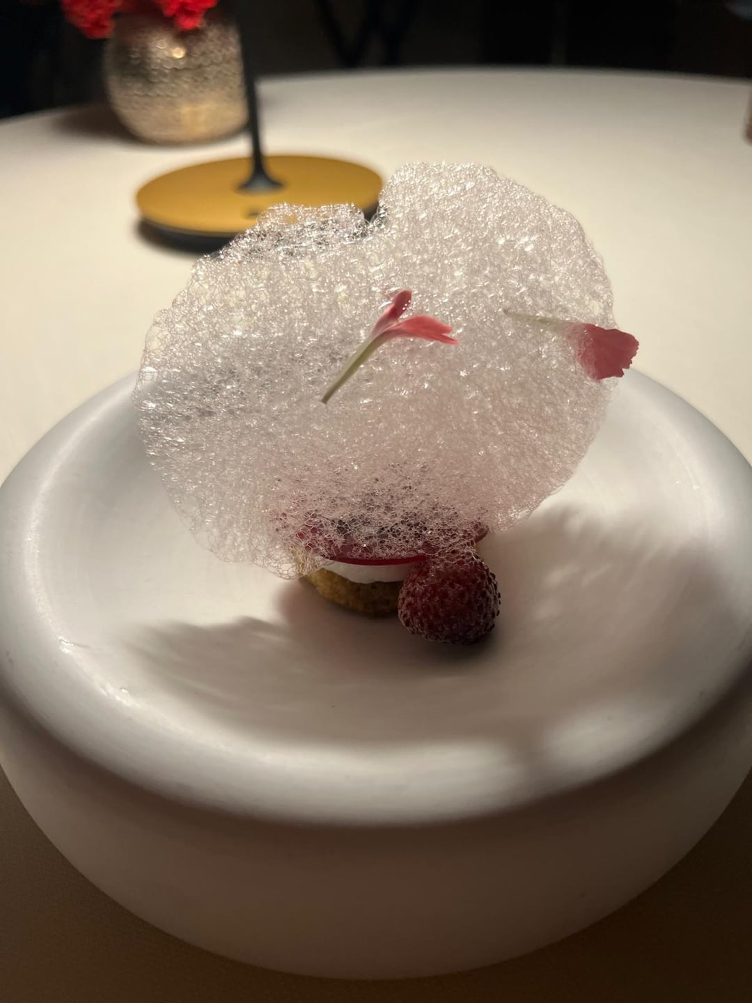 ~Strawberries, jam, balsamic sponge, hibiscus foam. Strawberries, jam and balsamic had different levels of sourness (most to least). The light and airy hibiscus foam helped balance the sourness. Table next to us found it too sour. Light, but not "refreshing" palate cleanser.