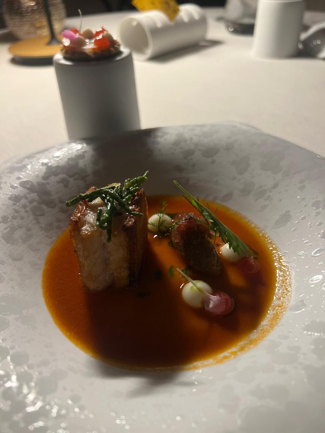~Red mullet saffron bread crust, red onion jam. Balanced, you get the idea.